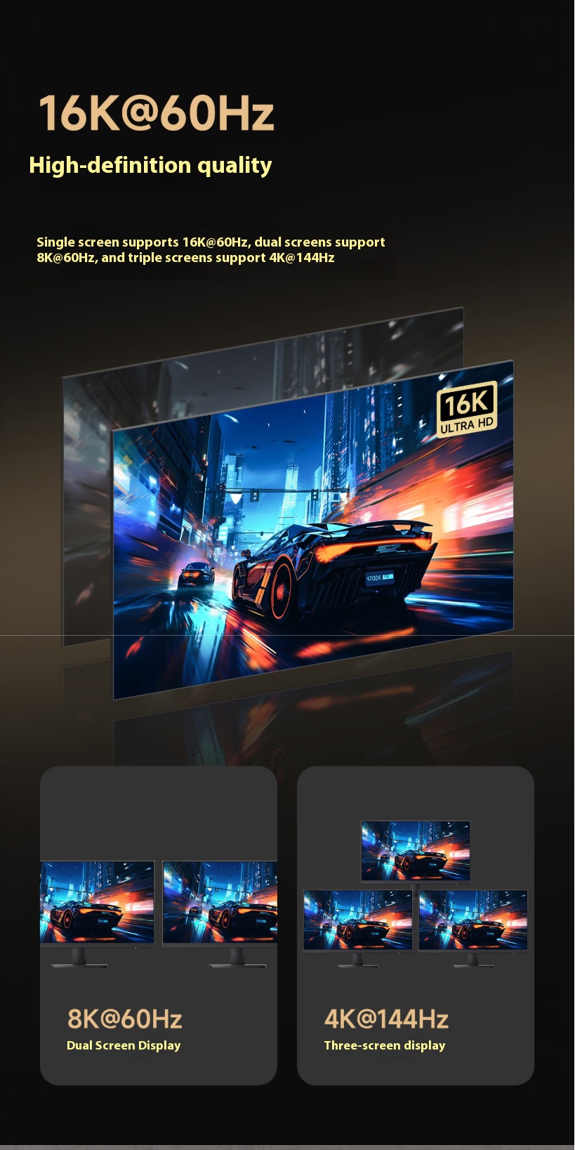 Supported Resolution: Single screen 16K@60Hz, dual screen 8K@60Hz, triple screen 4K@144Hz