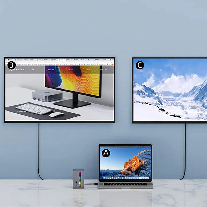 3. 4K@60Hz Multi-Screen Entension: External 2 monitors at the same time, support Mirror Mode and Extended Mode. USB-C(A) is the main dock interface, can control all the interfaces except the right HD. USB-C(B) can only control the right HD interfce. *Tip: Apple M1 chip does not support Multi-Screen, can only expand to one external screen, but M1 Pro and M1 Max chips are not limited.