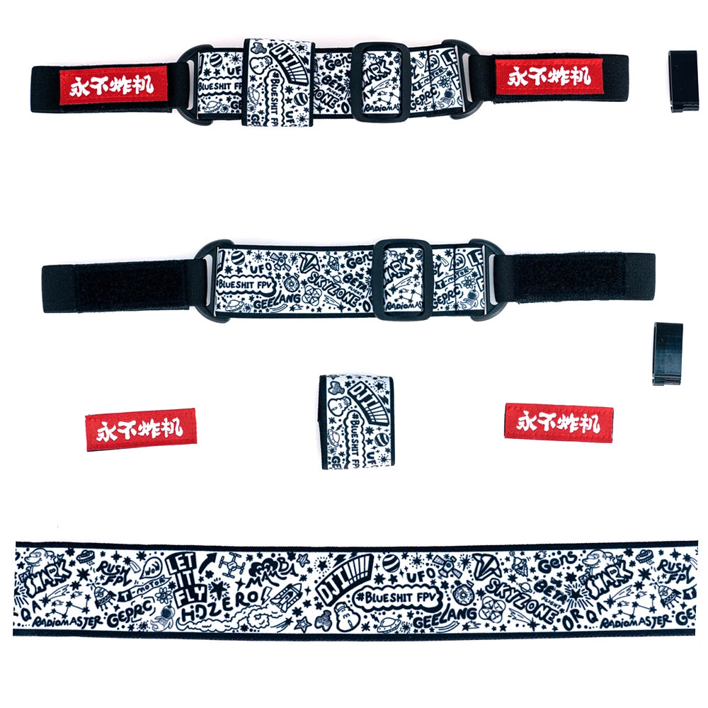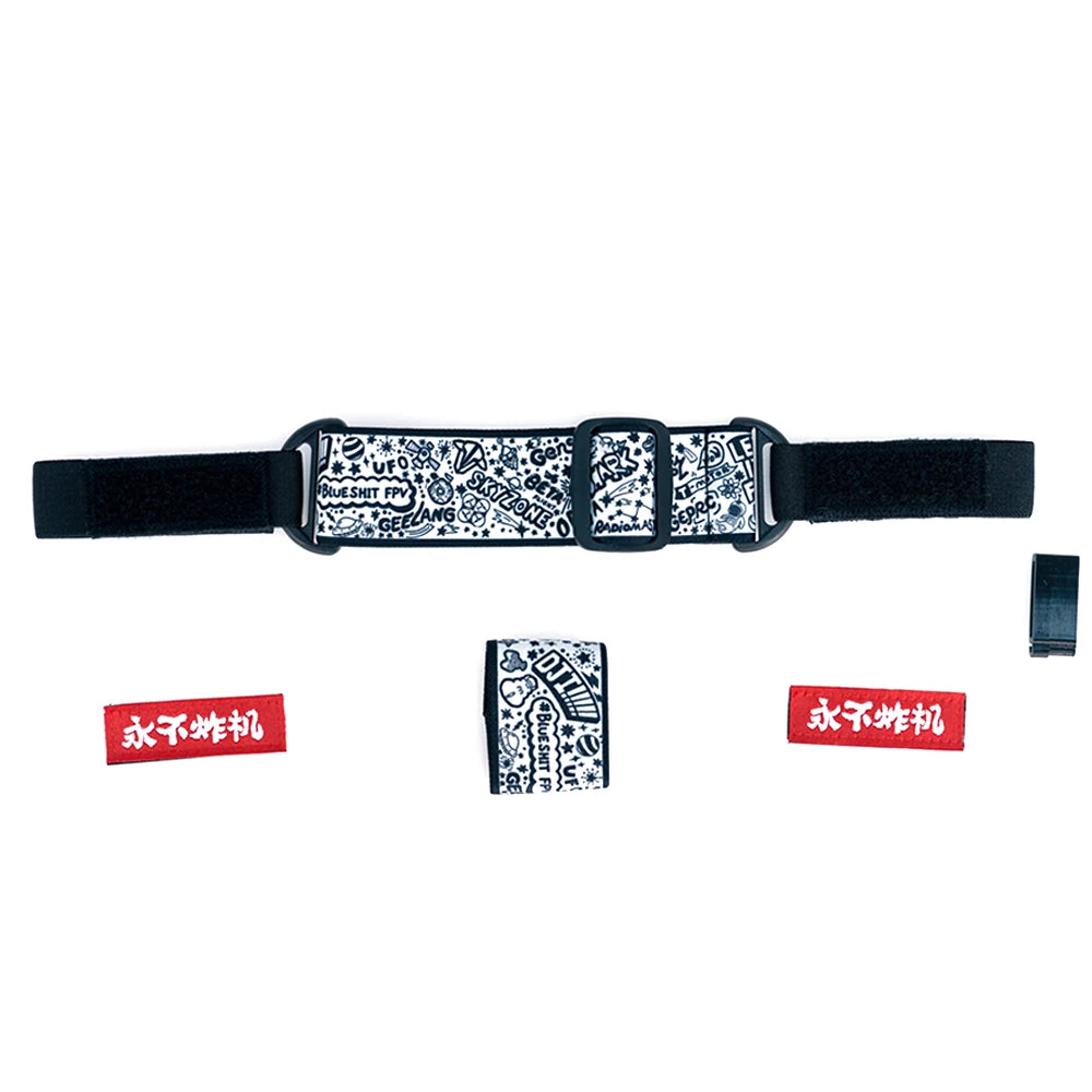 This FPV goggle head strap was hand-designed by the designer. The logo nameplate is made using a VelcroFastener, allowing buyers to replace it with their preferred badge. The battery strap can secure batteries of various sizes, and we also include a battery clip to prevent the battery connector from disconnecting during use.