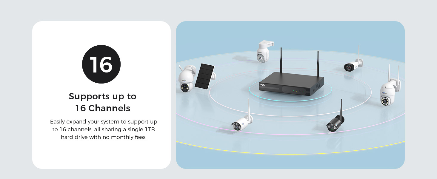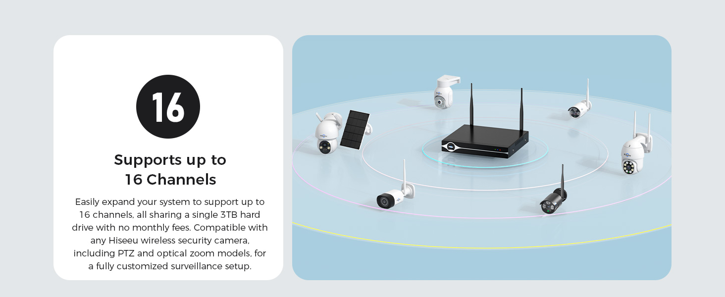 6. 16-Channel Expansion: Compatible with up to 16 cameras, sharing a single hard drive (up to 3TB), for a customizable and scalable surveillance system.