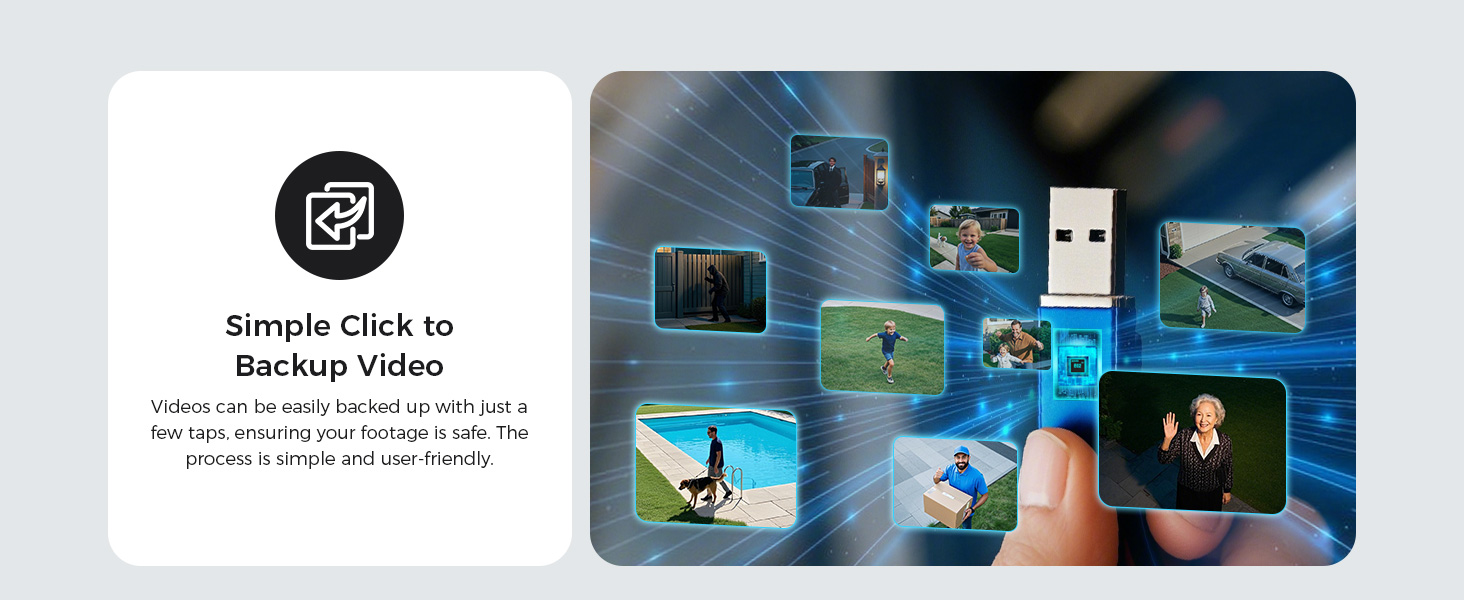 5. Easy Backup System: Videos can be securely backed up with just a simple click, ensuring all footage is safely stored.