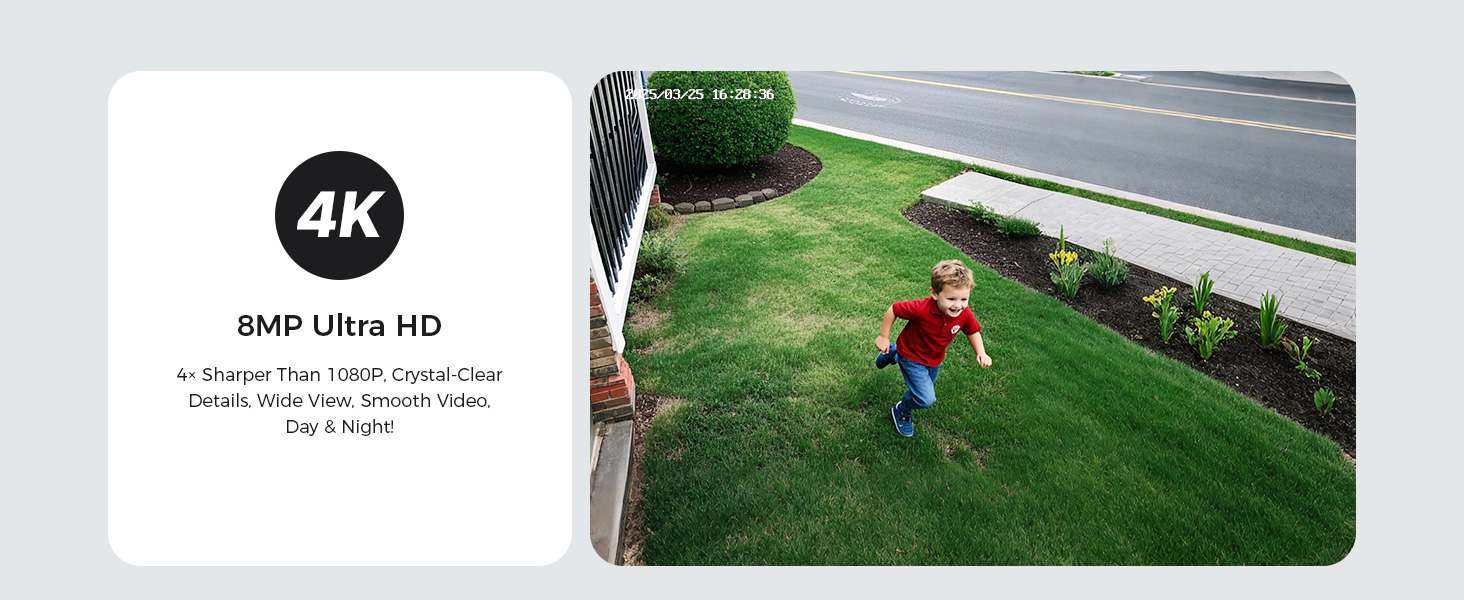 1. Ultra HD Clarity: 8MP resolution delivers crystal-clear footage, 4× sharper than 1080P, with wide viewing angles for enhanced coverage.