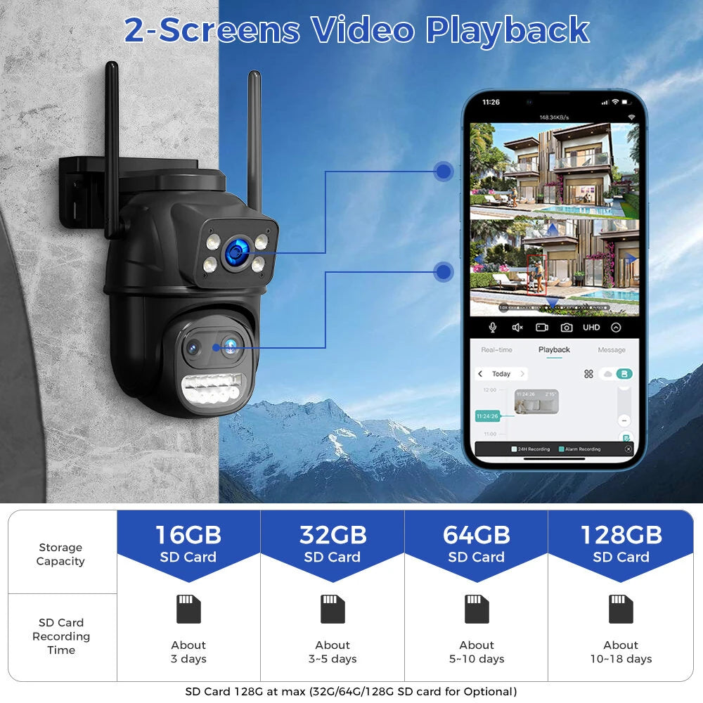 Equipped with 9MP and 3MP resolution options, this camera offers crisp, clear images and videos. The dual-lens system with dual screens enhances visibility and monitoring performance, making it an excellent choice for detailed surveillance.