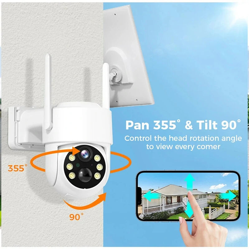 IP65 weatherproof solar outdoor security wireless camera is available in multiple places. It can be used safely regardless of rain, sunlight, or other adverse weather conditions and is able to work in -20°-55°. Pan/Tilt solar cameras for home security can be rotated 355° horizontally and 90° vertically.