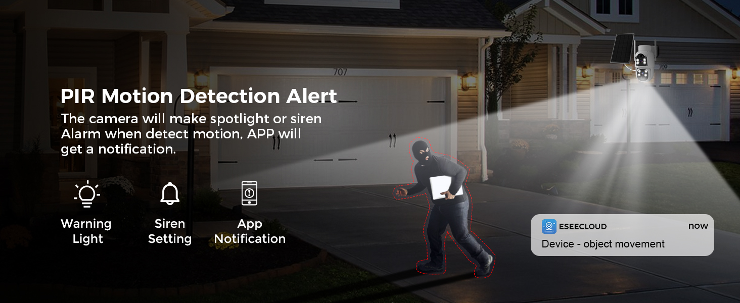 5. Robust Motion: With PIR motion sensors, the camera triggers spotlight or siren alarms upon detecting motion, instantly notifying you via app notifications for swift action.