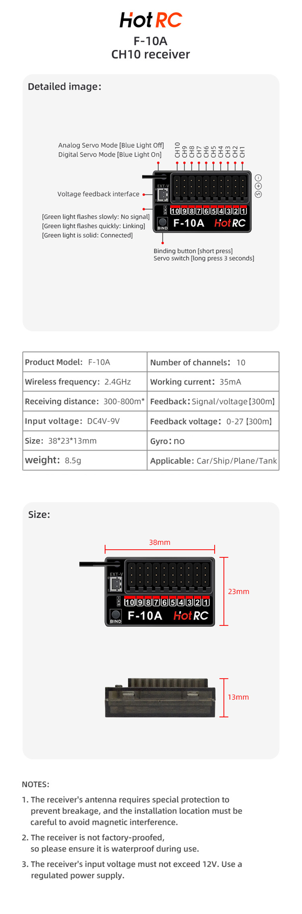 HOTRC F-10A 2.4GHz 10CH PWM Receiver for HT-10A CT-10B Radio Transmitter RC Car Boat Ship Airplane Tank Models