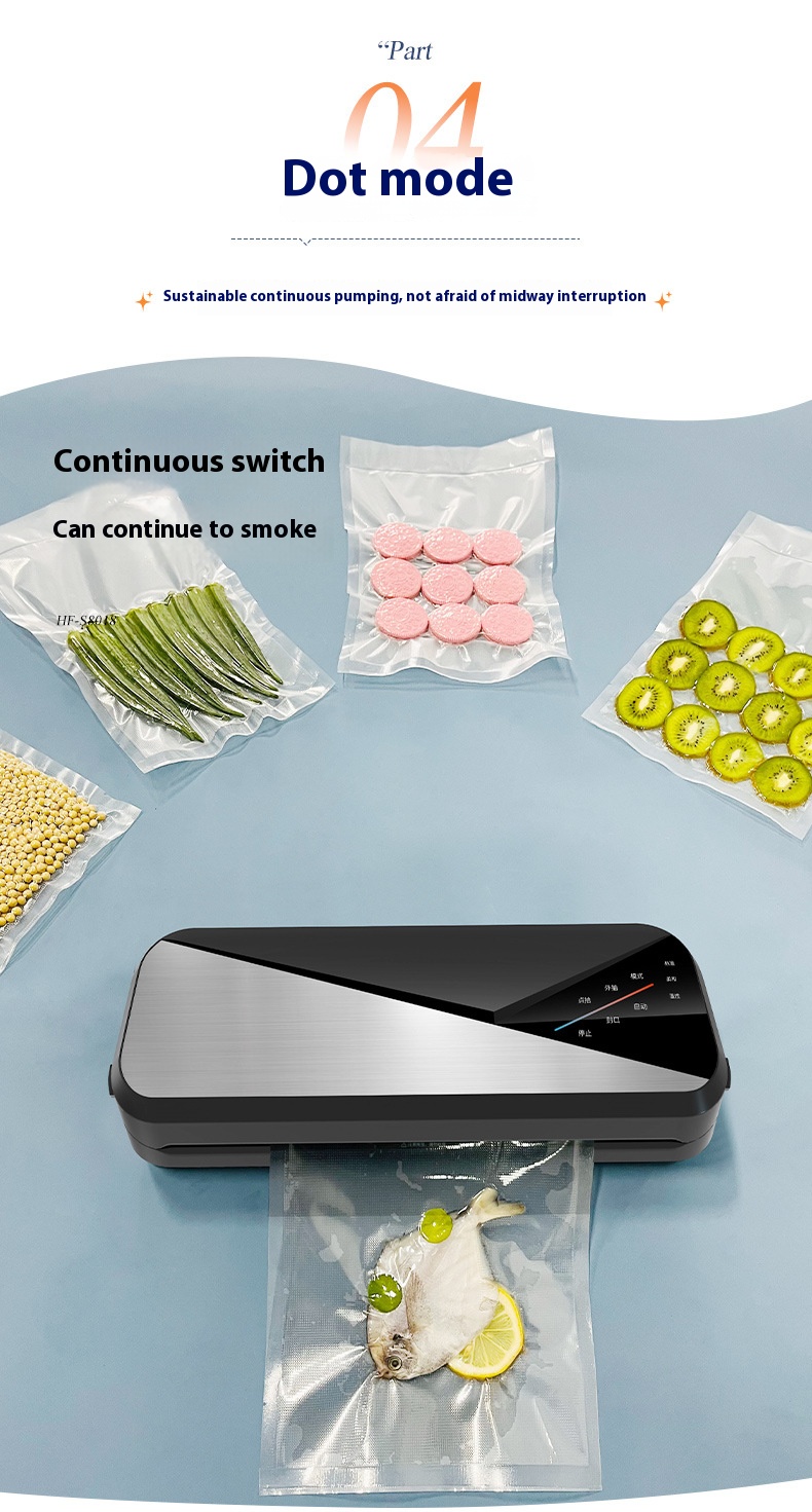 Supports various sealing modes including vacuum seal, independent seal, external vacuum capabilities, and pulse extraction. This versatility ensures compatibility with different food types such as dry, moist, powdery, oily, and soft items.