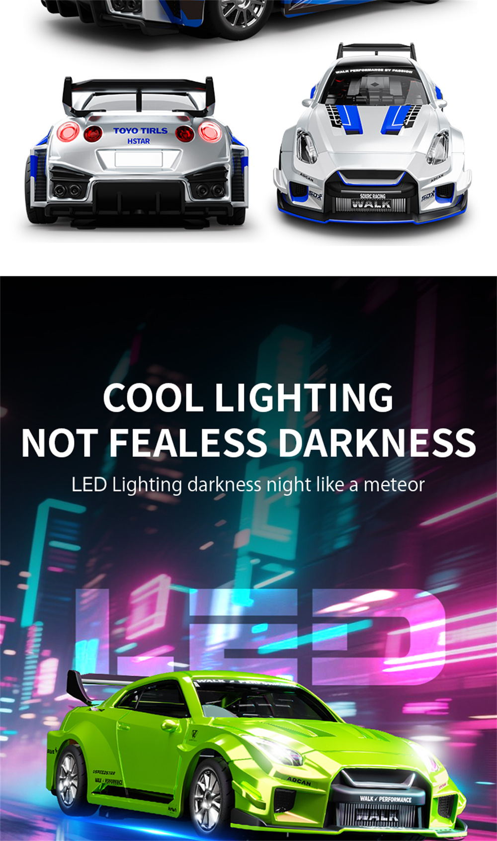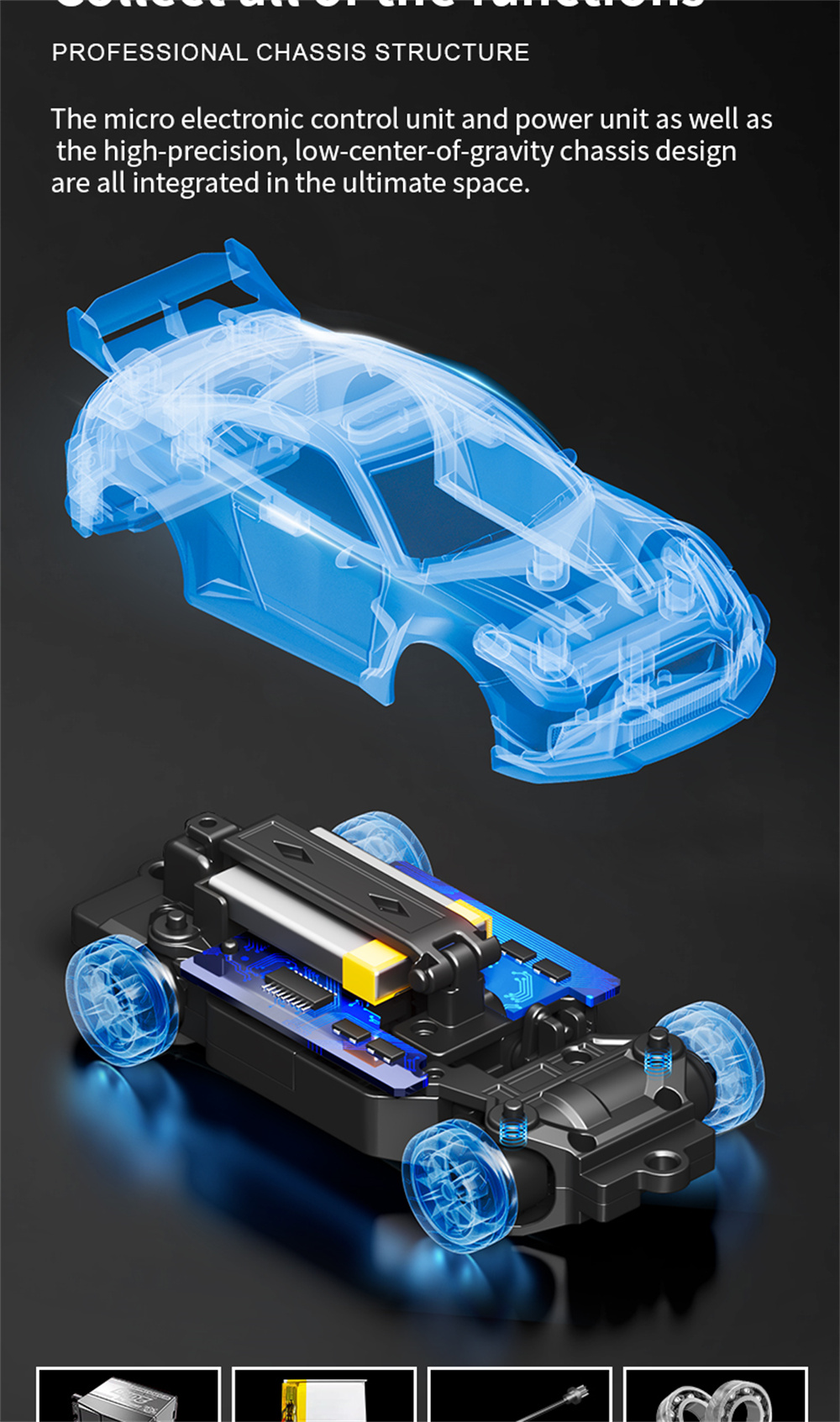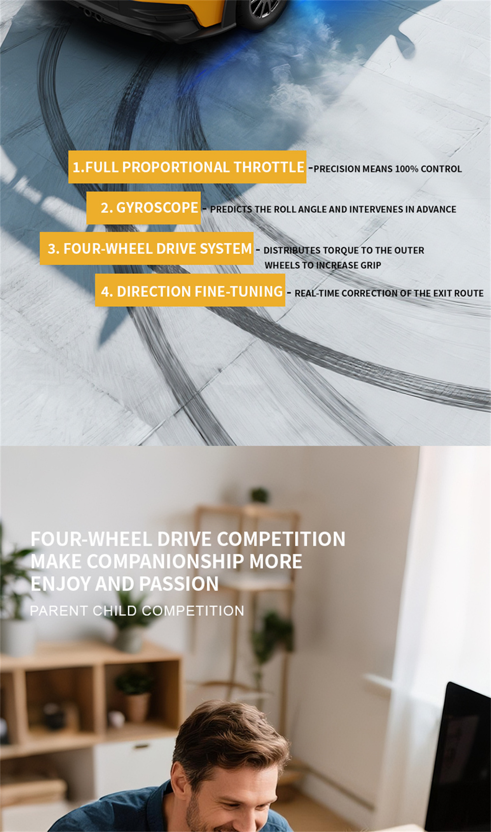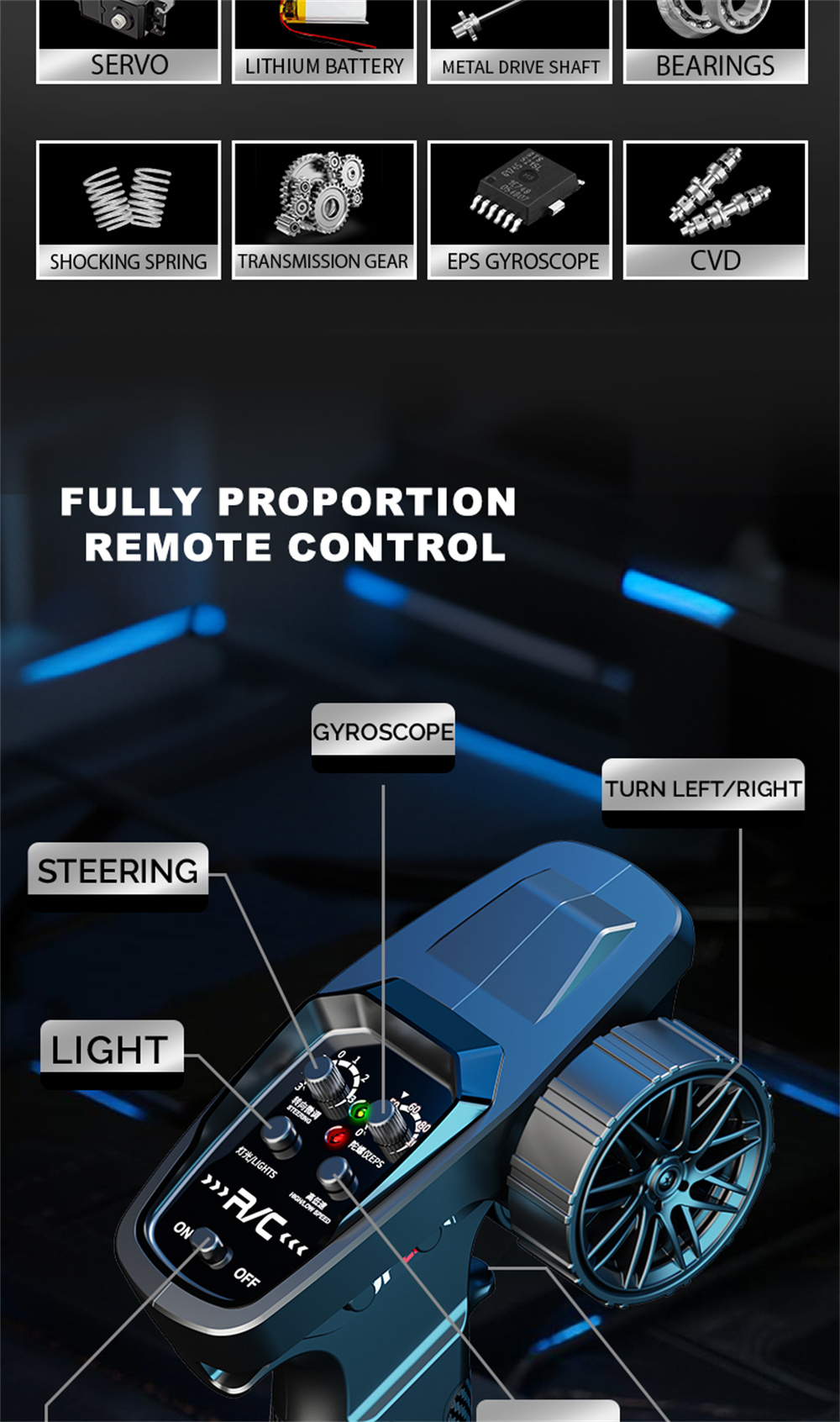 The whole vehicle adopts silent bearings, full-proportional electronic steering ratio adjustment, gyroscope sensitivity adjustment, speed adjustment, controllable front and rear/chassis led lighting