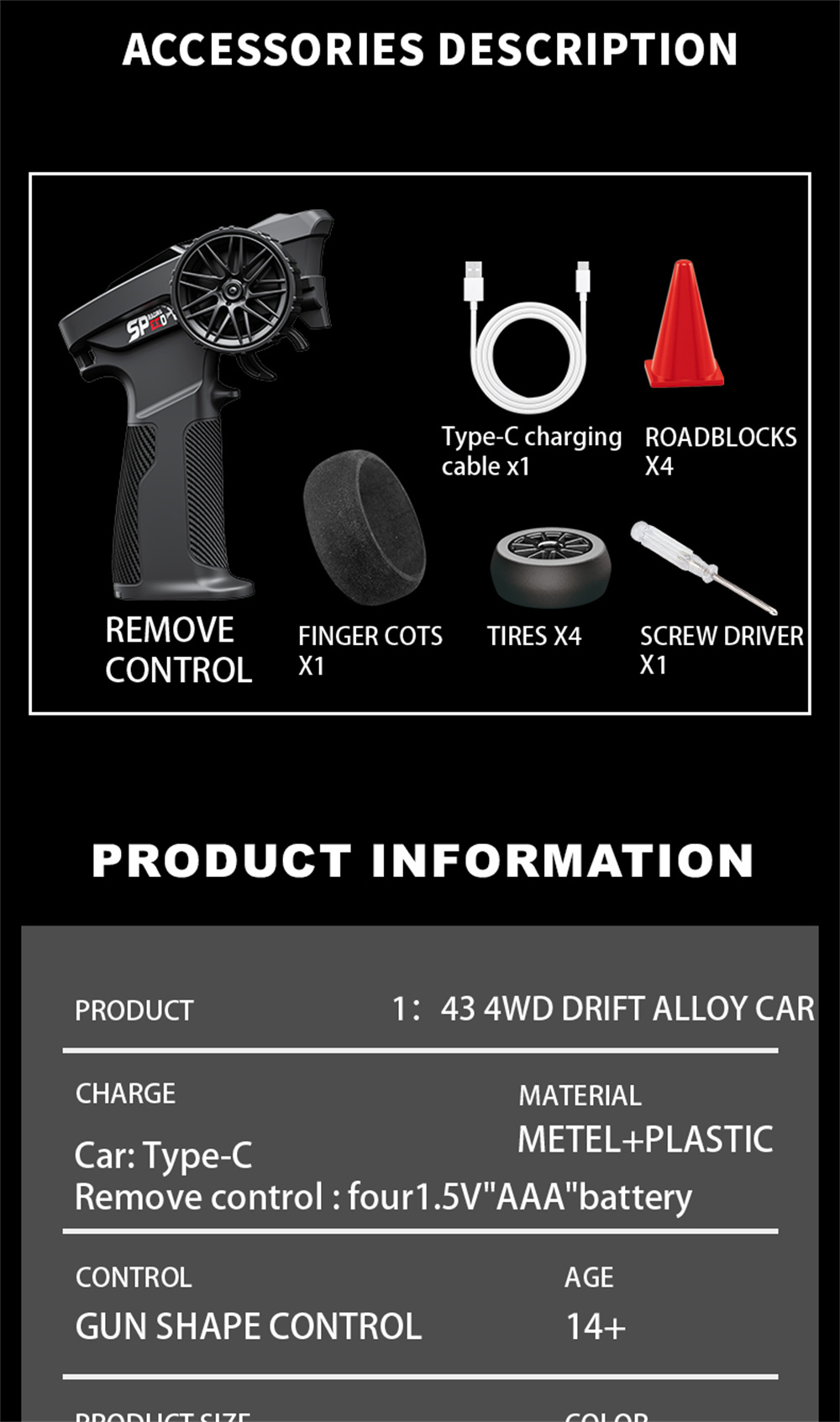| Transmitter | Frequency:2.4G Channel:4CH Remote Distance:>35m Required Battery:2X 1.5V AA battery(not included) |