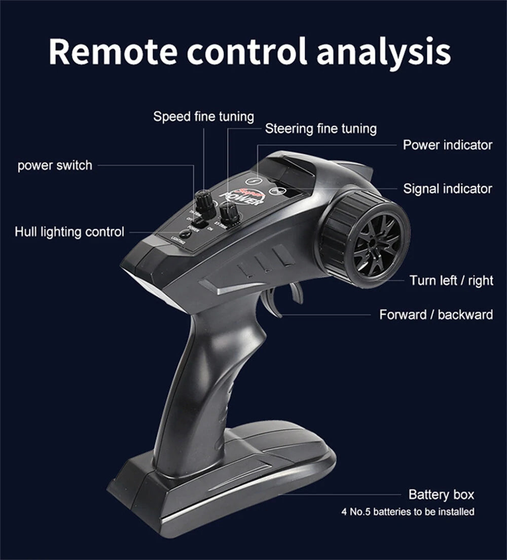 Forward and backward,left turn right turn,capsizing rest,low power alarm8-character demonstration,overtaking prompt,anti rollover function,nightnavigation light(can be turned on/off)