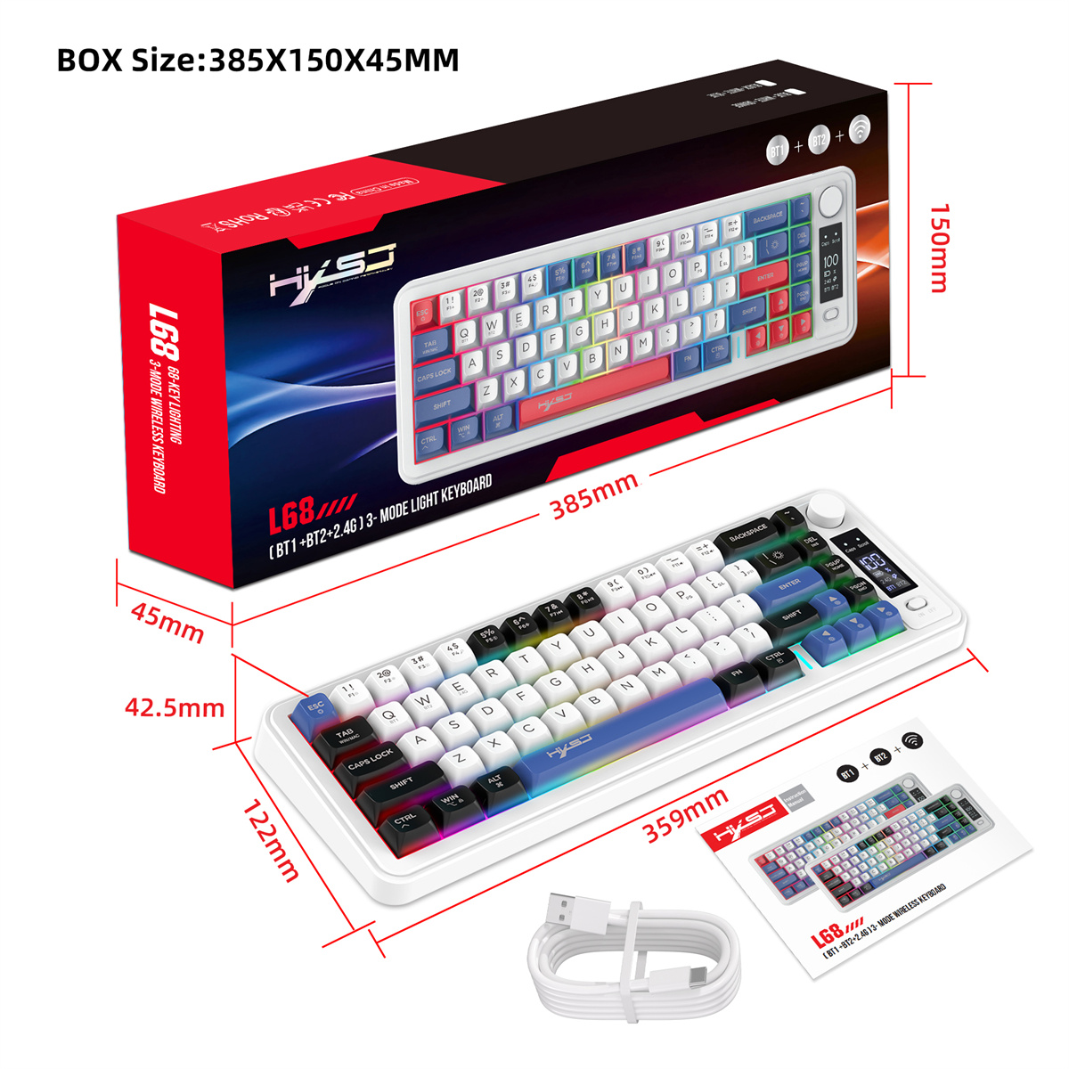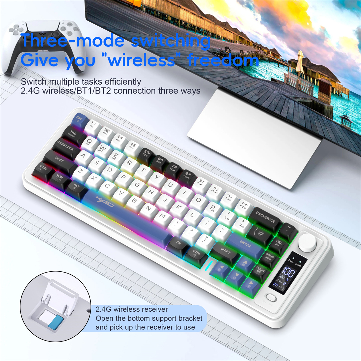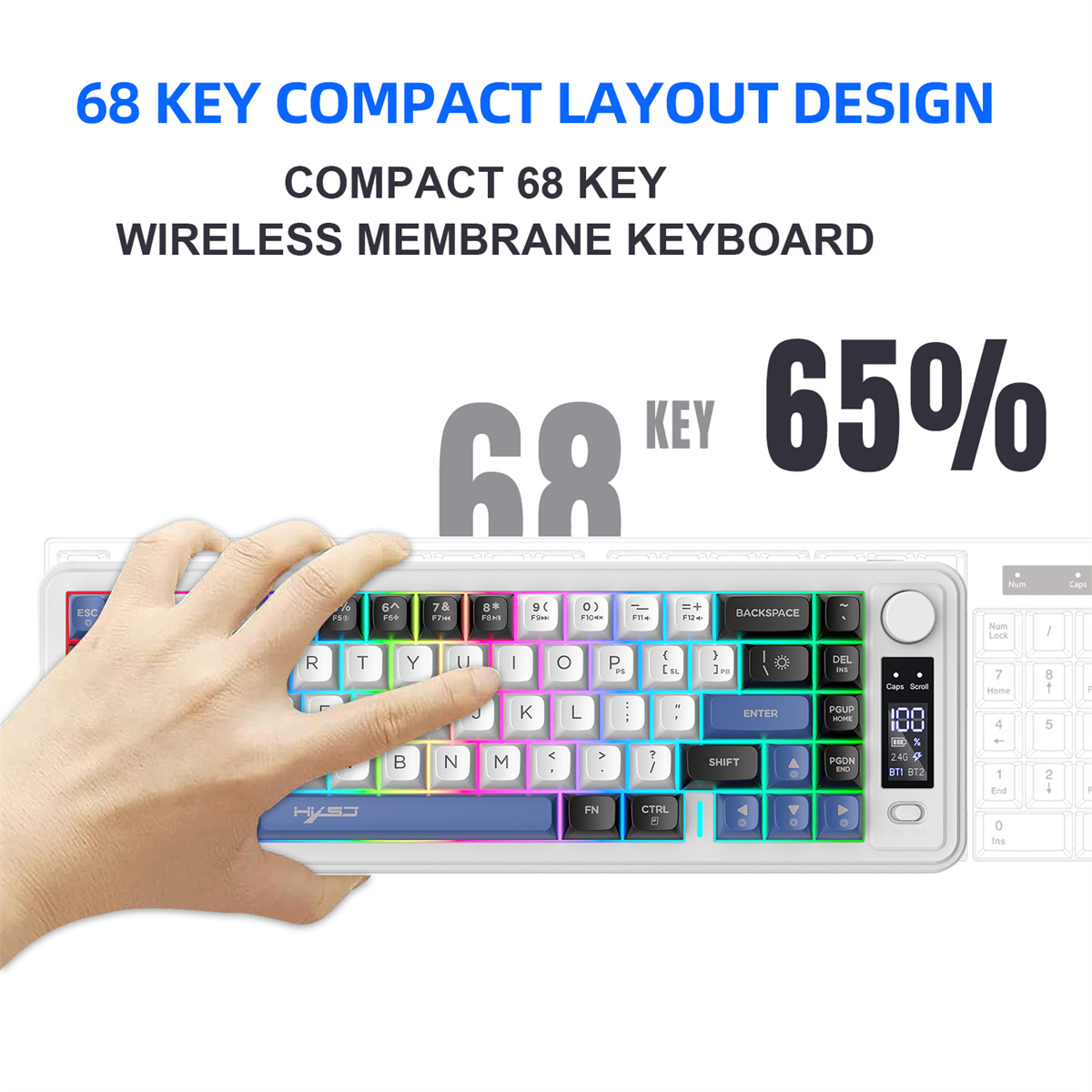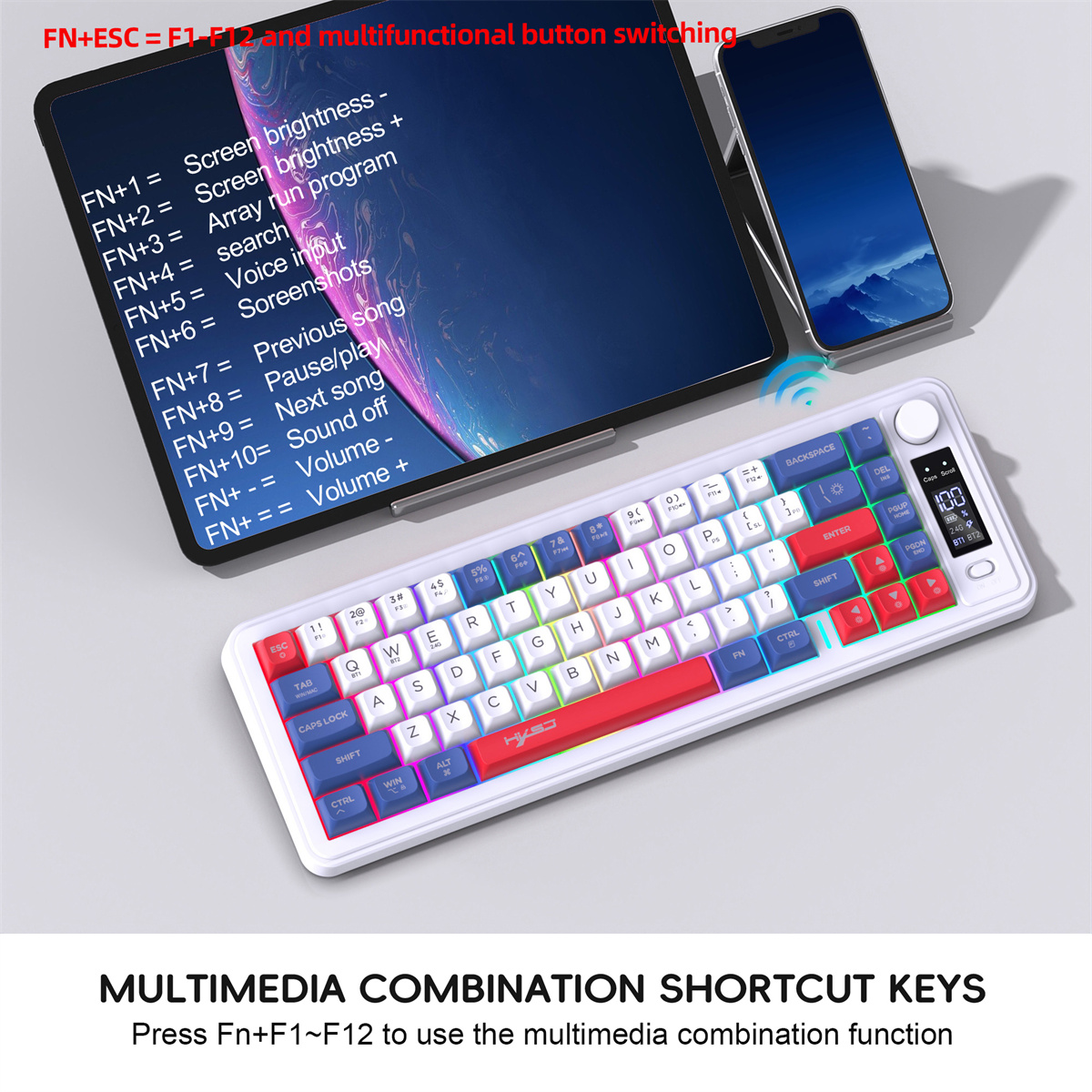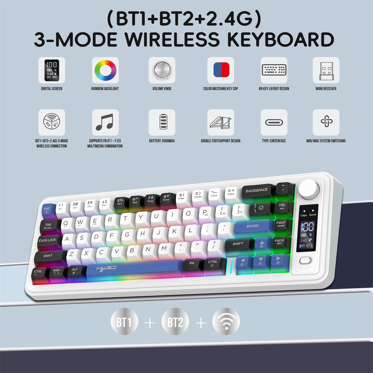 1: Three mode 'BT1+BT2+2.4G' 68 key wireless keyboard can be connected to three devices at the same time, and can be quickly switched with one key.