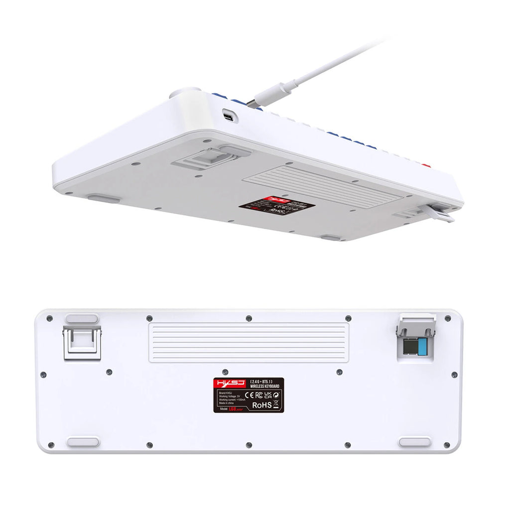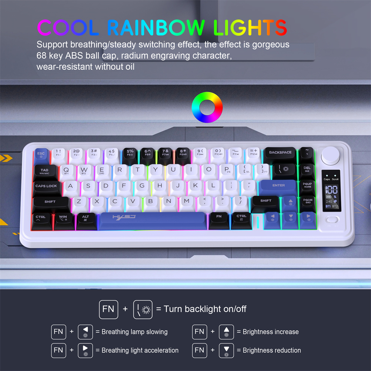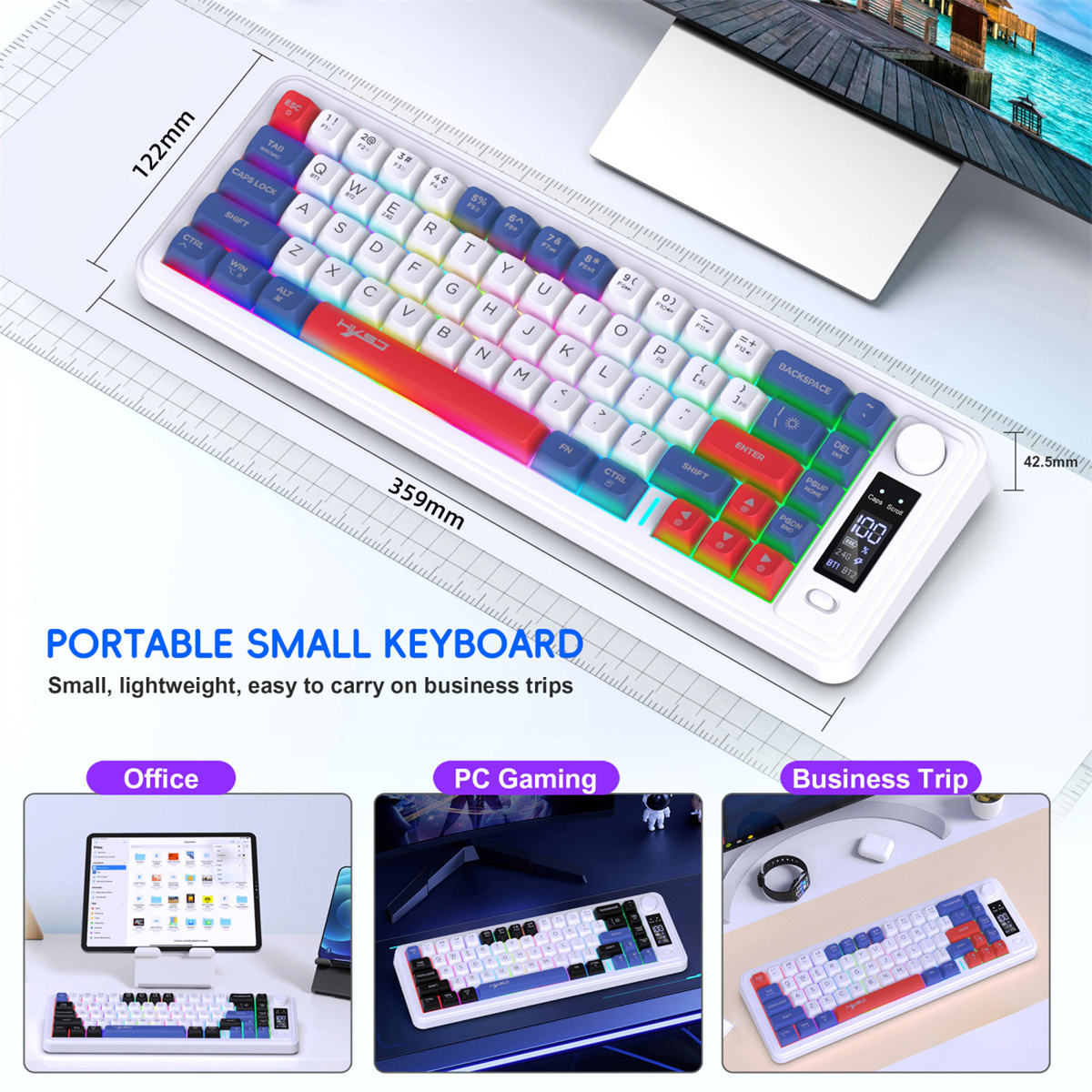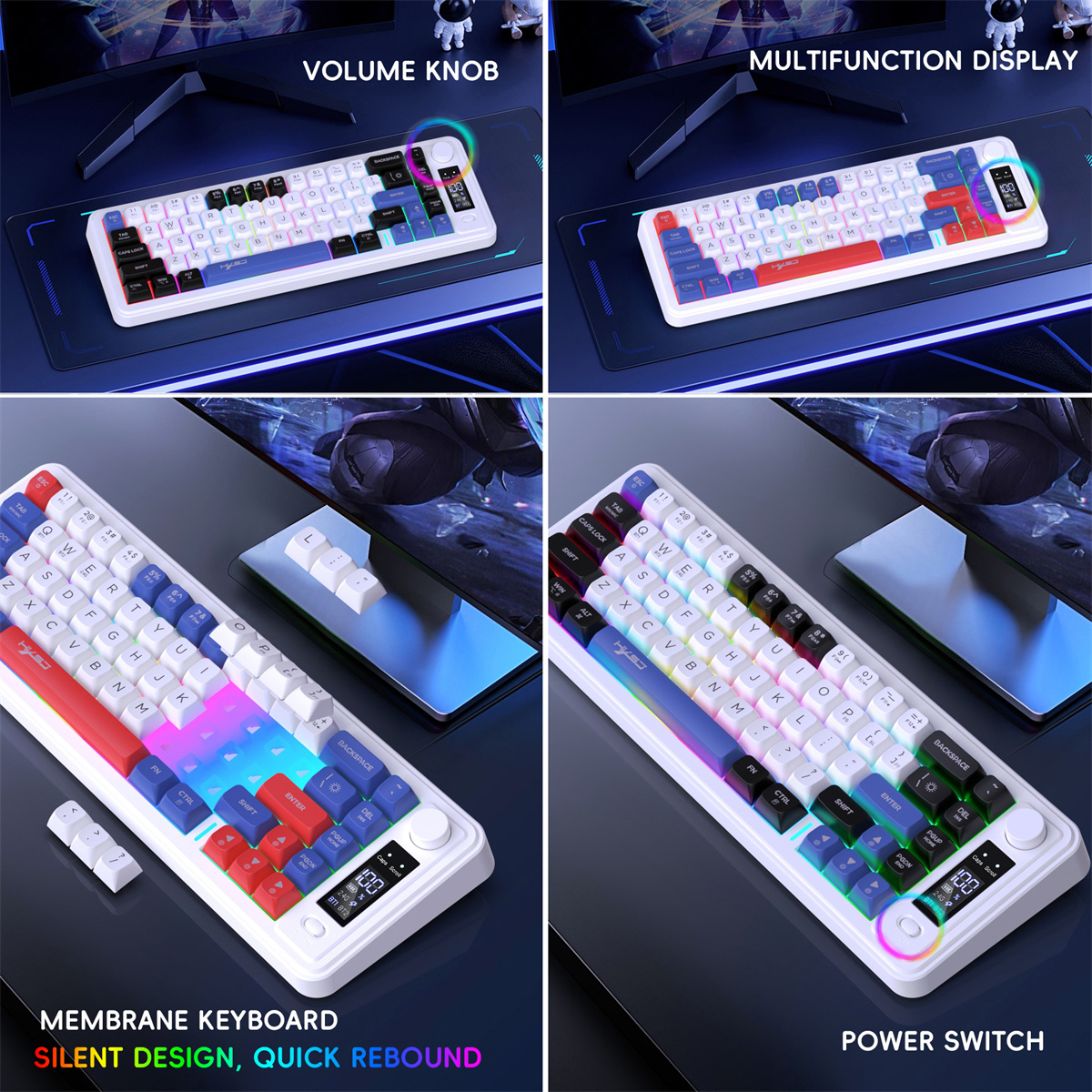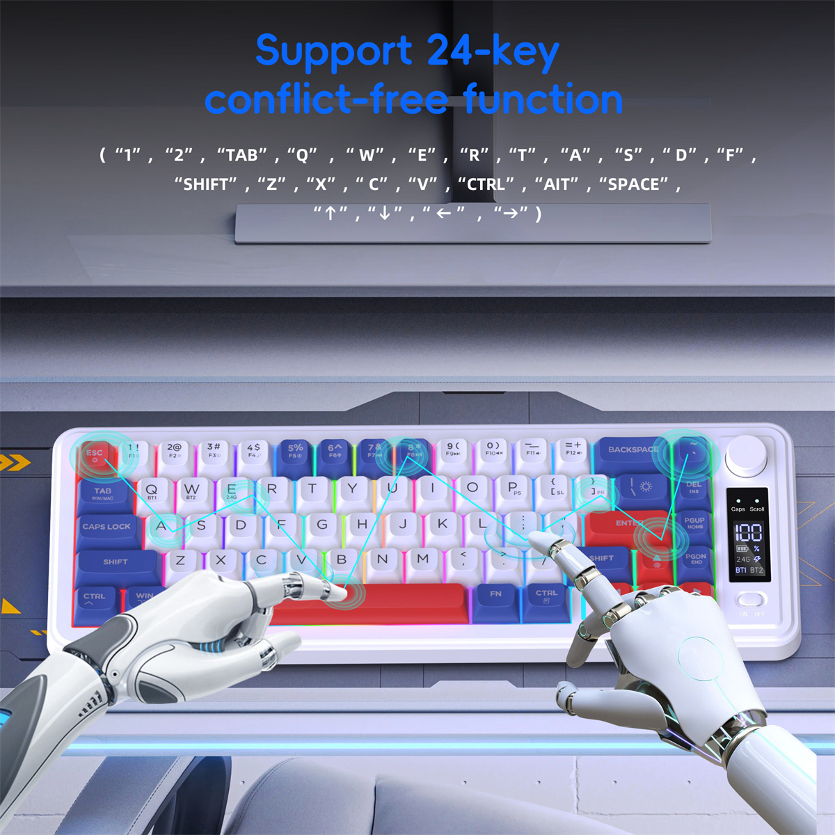 1: Three mode 'BT1+BT2+2.4G' 68 key wireless keyboard can be connected to three devices at the same time, and can be quickly switched with one key.