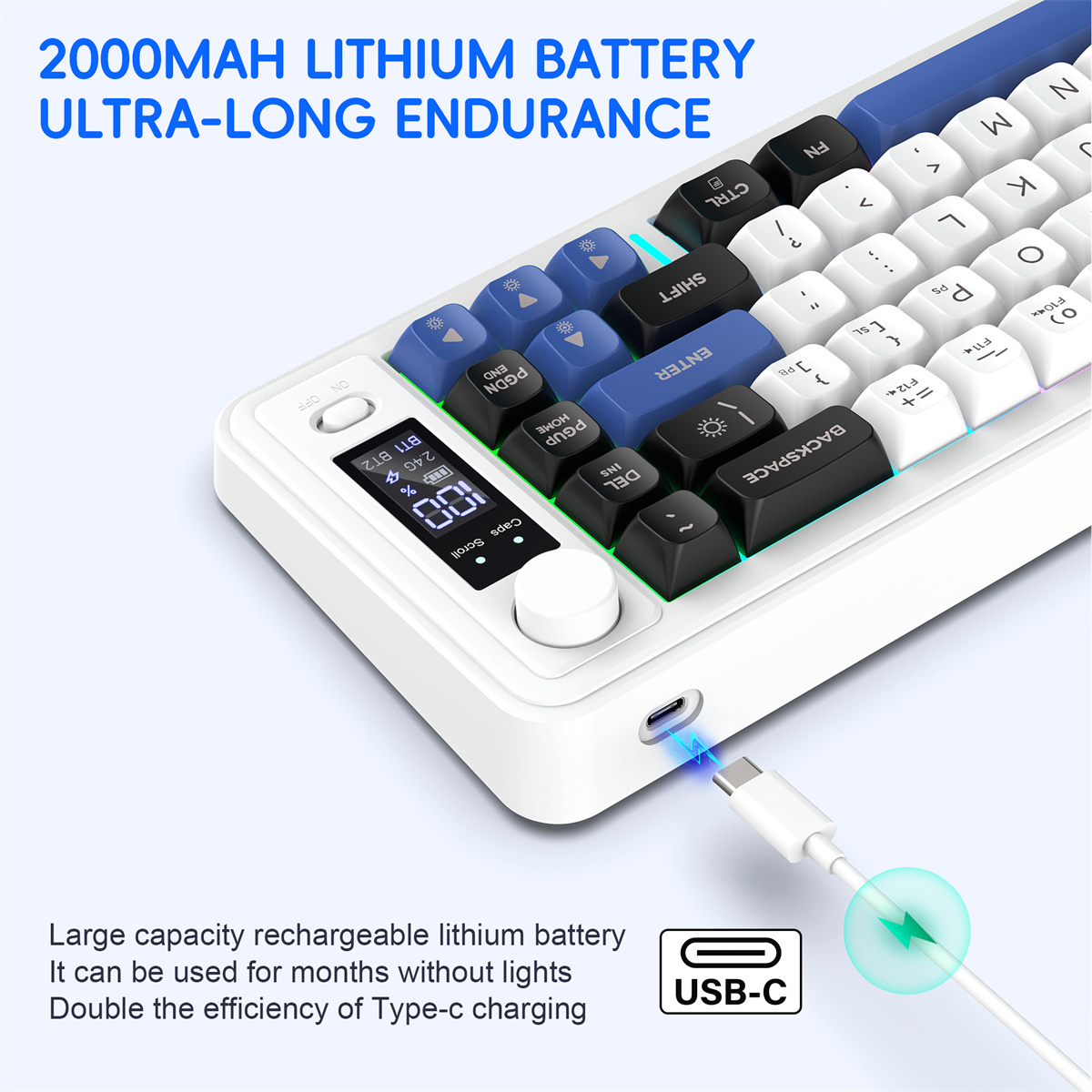 Press FN+E to switch to 2.4G wireless connection mode, and the 2.4G light on the display screen will flash. After inserting the blue USB receiver into the computer, the 2.4G light will remain on and the keyboard light will turn on normally. The keyboard can be used normally.