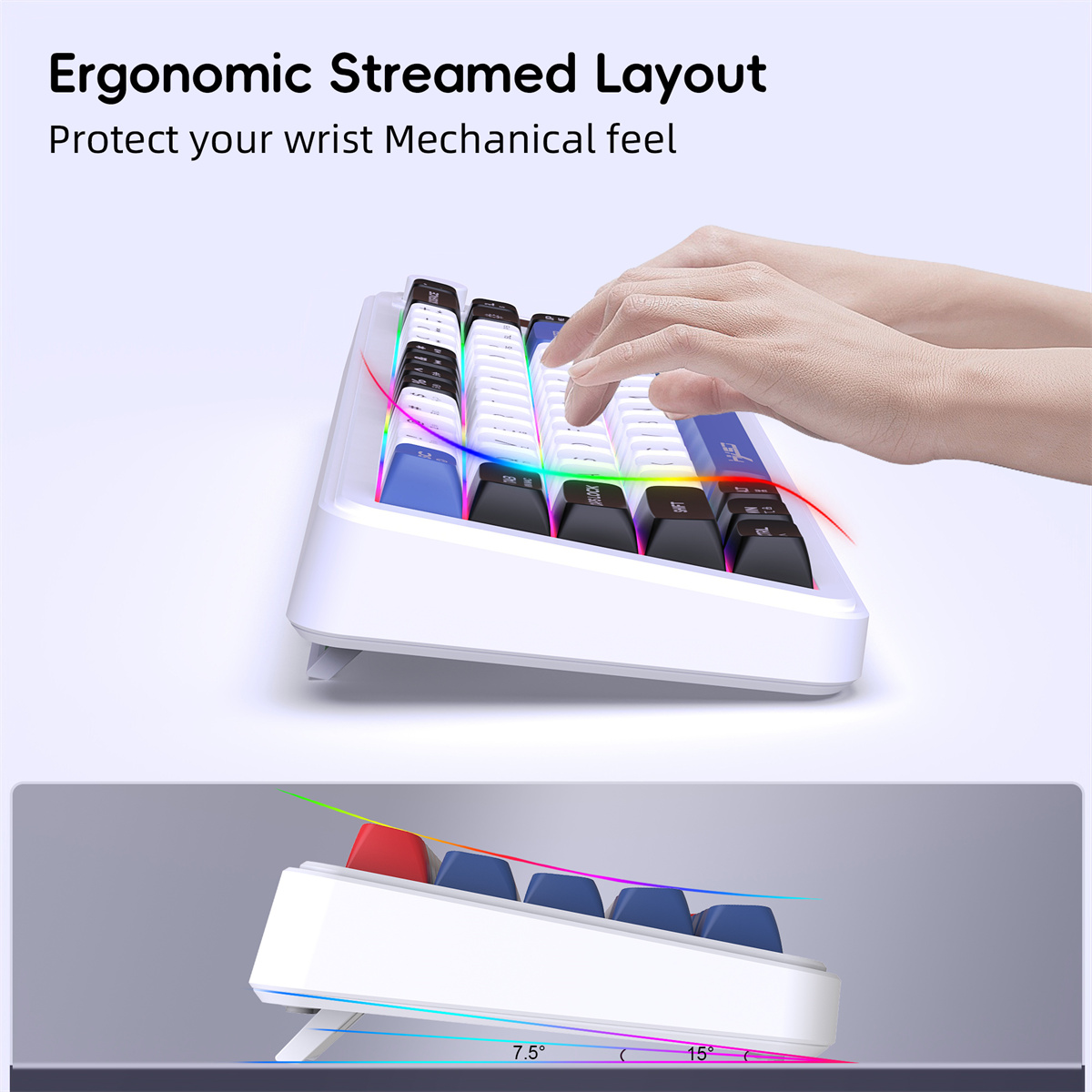 4: The 65% 68 key compact keyboard design greatly saves desktop space, and the ergonomic bipod design of the keyboard allows for easy and free adjustment of typing angles during use.