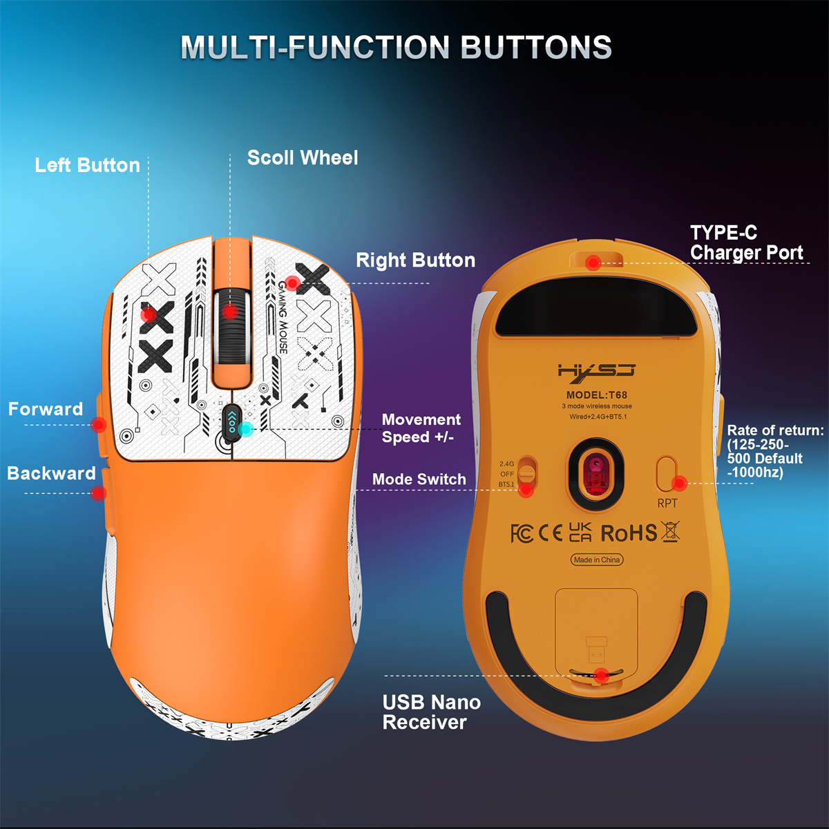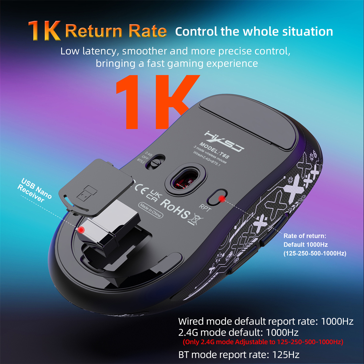 Turn down the power switch at the bottom of the mouse to the BT state ,The blue light flashes quickly to search for the Bluetooth name 'T68 Mouse' and connect it. If the blue light flashes slowly in Bluetooth mode, please press and hold the DPI button for 3 seconds to activate Bluetooth. The blue light will change from slow flashing to fast flashing, and you can search for 'T68 BT5.1 Mouse'. Connect and use it.