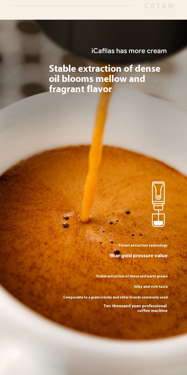 - 9-bar Golden Extraction Pressure: Emulating the standards of the Italian Coffee Association, our machine uses professional 9-bar extraction pressure to mirror the Golden Cup principle, preserving the coffee's natural, original flavor.