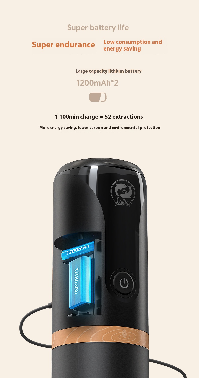 - Ultra-Long Battery Life and Low Carbon Footprint: Equipped with two high-capacity 1200mAh lithium batteries, this portable espresso machine supports up to 52 extractions. It's designed to be energy-efficient, power-saving, and environmentally friendly.
