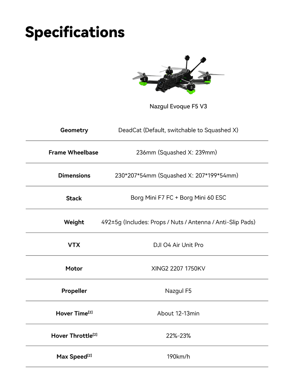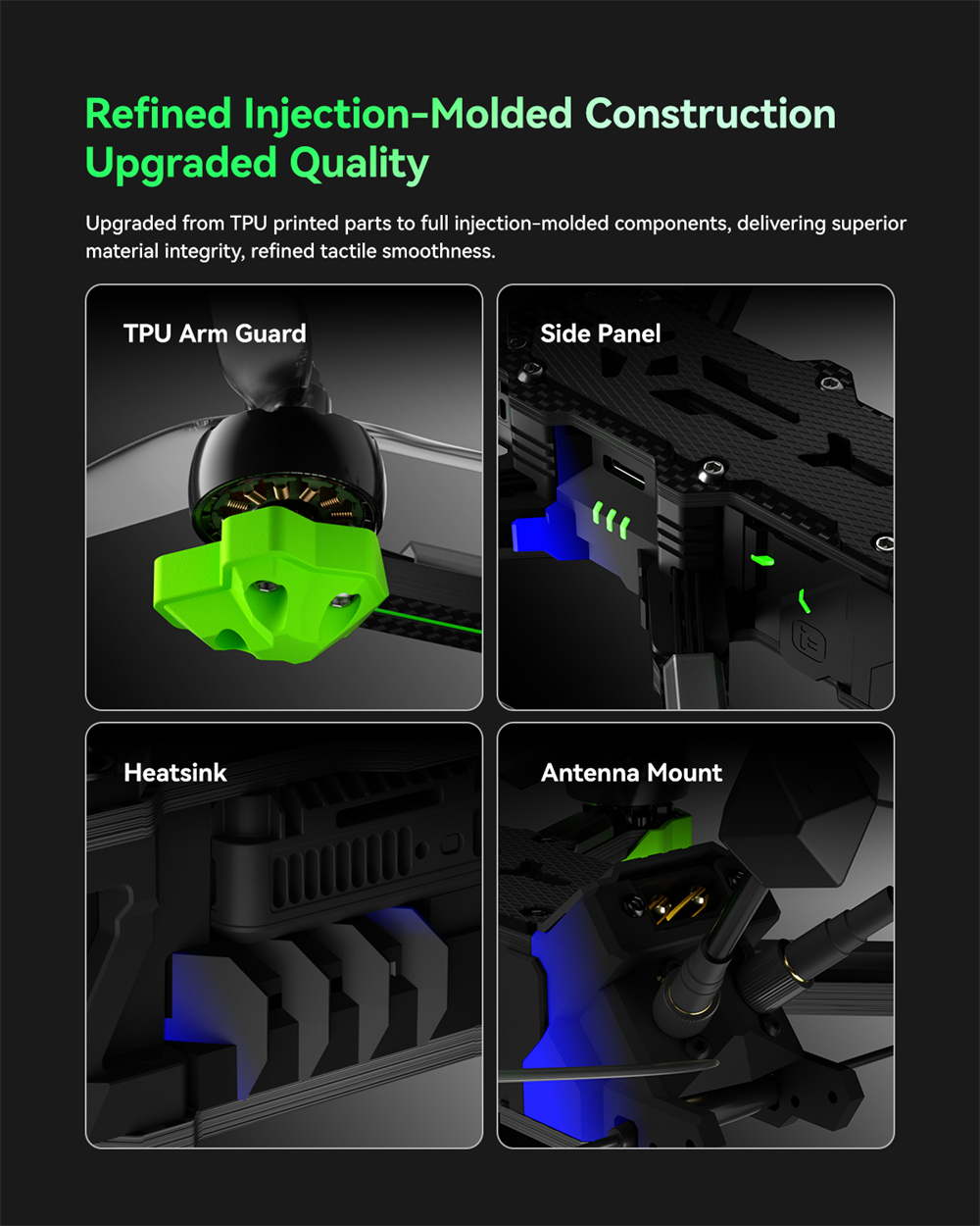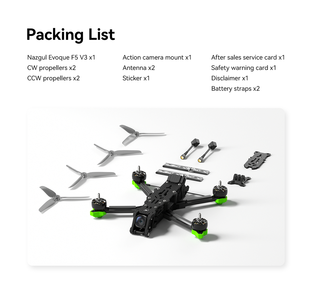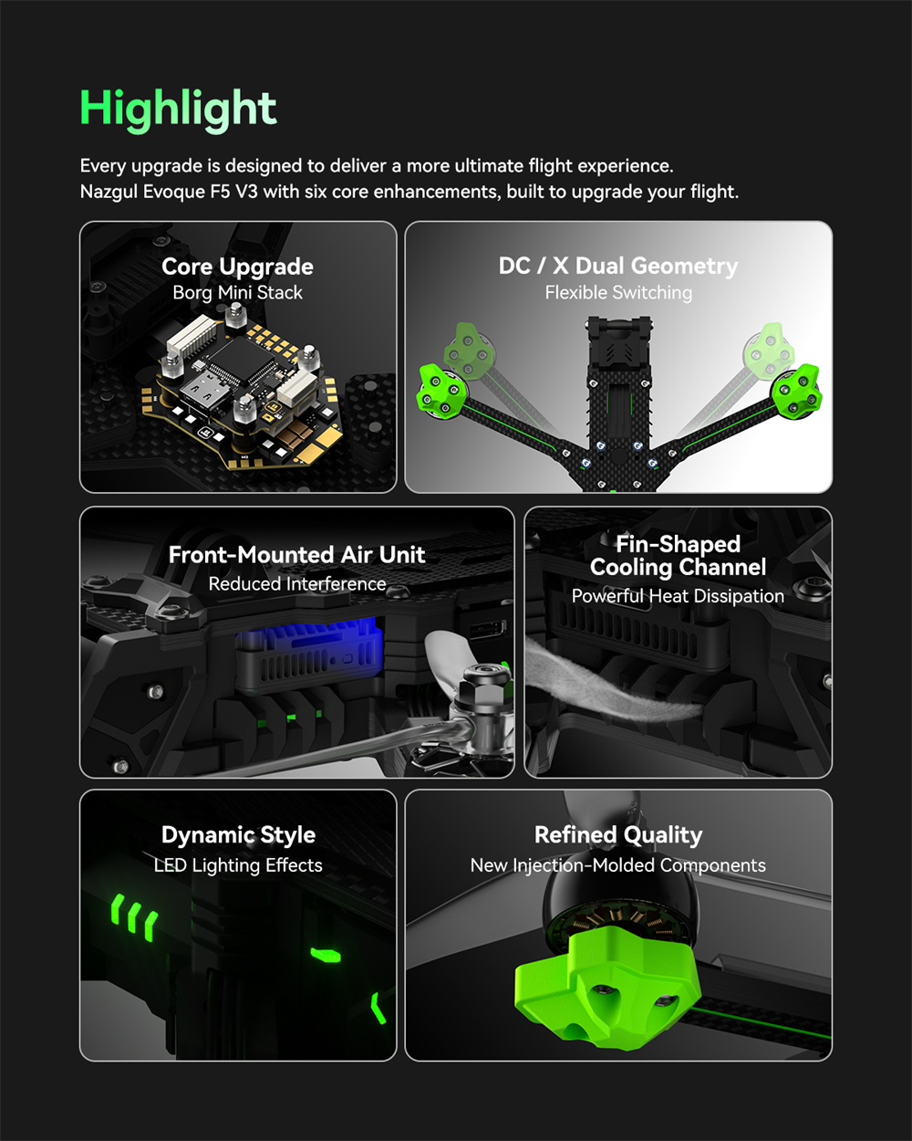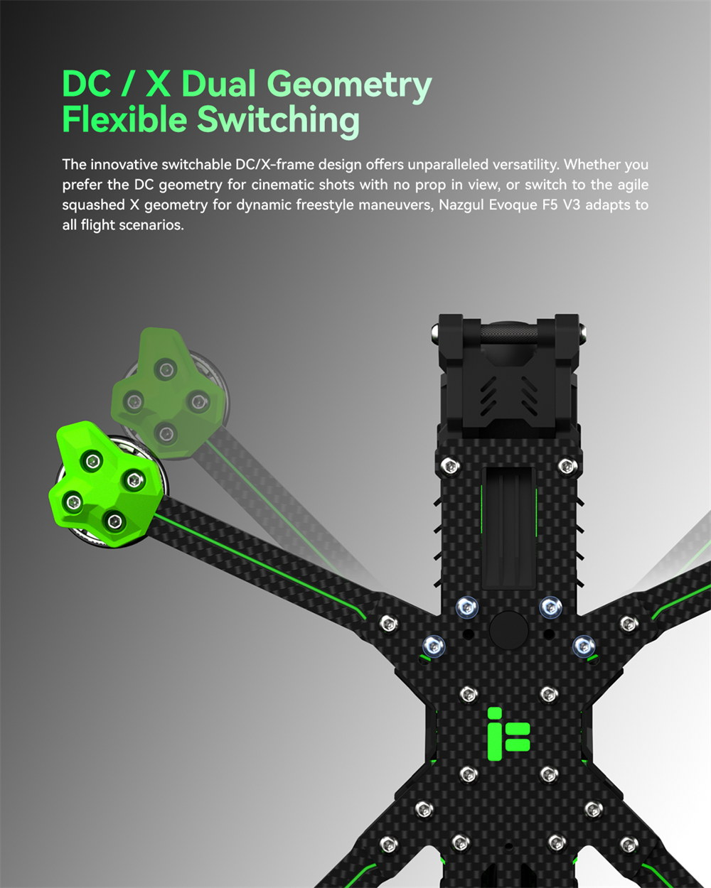 The innovative switchable DC/X-frame design offers unparalleled versatility. Whether you prefer the DC geometry for cinematic shots with no prop in view, or switch to the agile X geometry for dynamic freestyle maneuvers, Nazgul Evoque F5 V3 adapts to all flight scenarios.