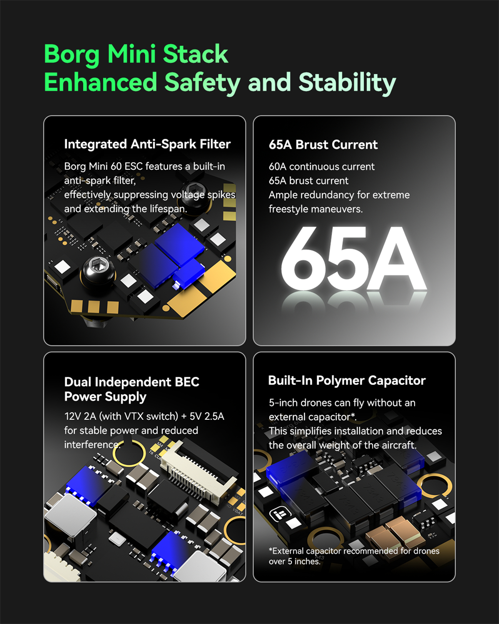 Integrated anti-spark Filter, 65A brust current, dual independent BEC power supply, and built-in polymer capacitor further enhancing safety and stability.