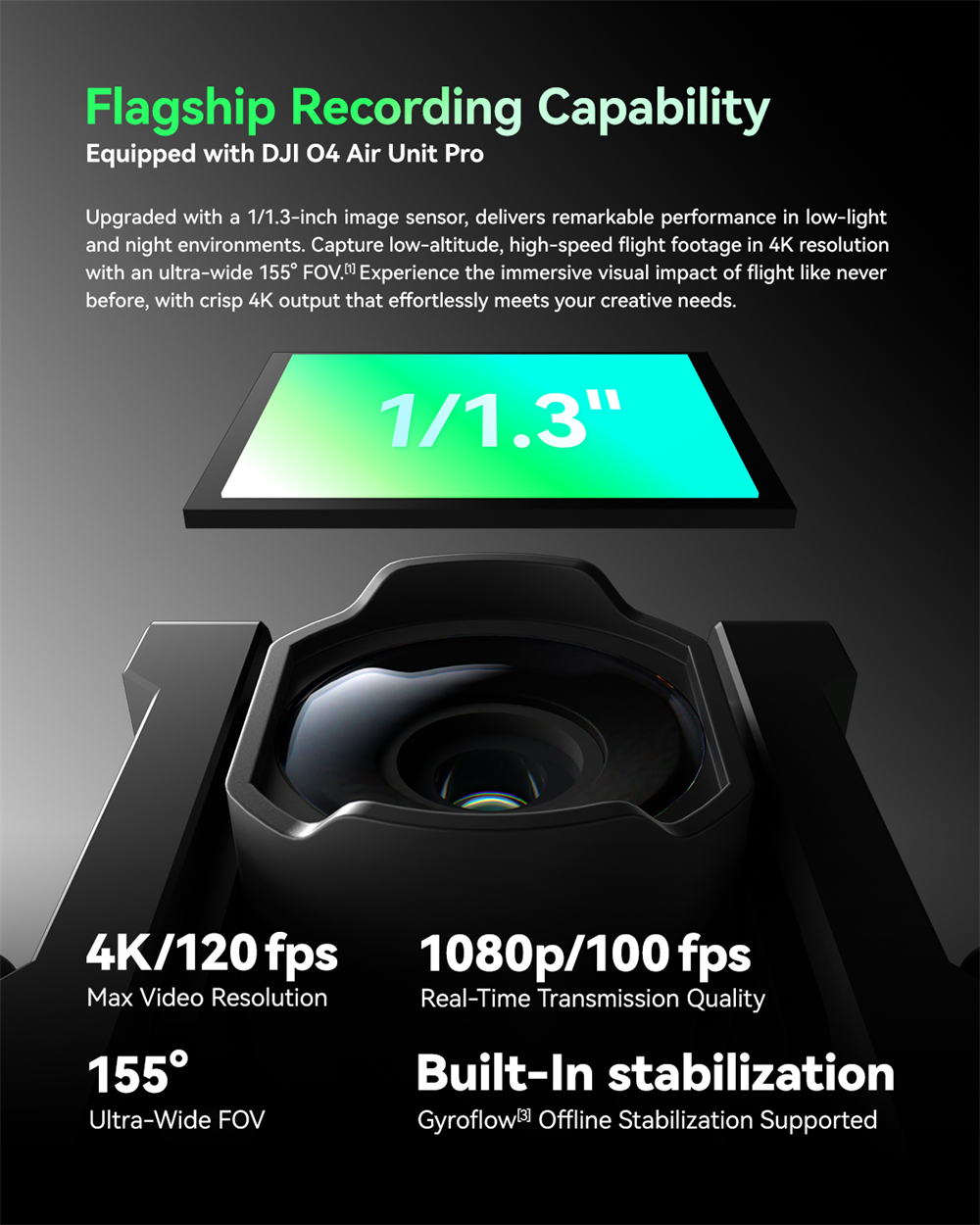 Upgraded with a 1/1.3-inch image sensor, delivers remarkable performance in low-light and night environments. Capture low-altitude, high-speed flight footage in 4K resolution with an ultra-wide 155° FOV. Experience the immersive visual impact of flight like never before, with crisp 4K output that effortlessly meets your creative needs.
