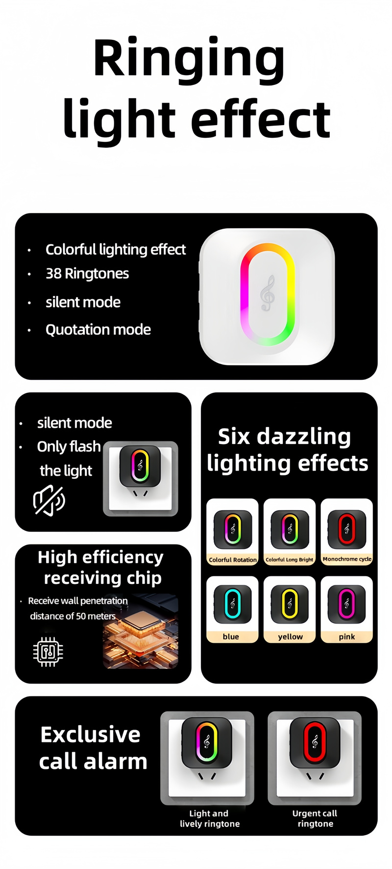4. Exclusive Call Alarm Design: Distinct modes for general calls and urgent alarms, each paired with specific sounds and light signals for easy identification.