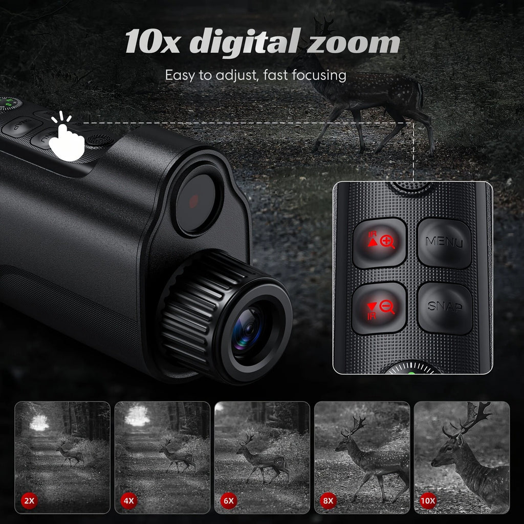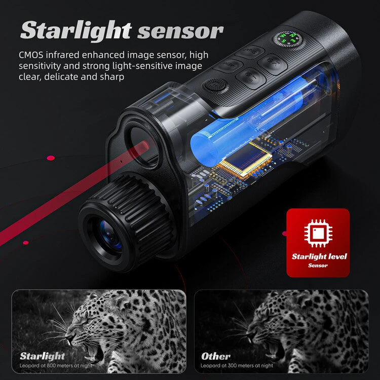 Feature:1.High-Definition Digital Night Vision Monocular: With an 800-meter night vision range, capture clear 1080P images effortlessly. The advanced optics and coating technology provide vivid and high-resolution visuals even in challenging lighting conditions.2.Infrared Night Vision Telescope Performance: Equipped with a powerful 5W IR illuminator, observe up to 800m in complete darkness. This makes the scope perfect for twilight explorations and nighttime wildlife observations.3.CMOS Sensor Clarity: The monocular telescope boasts a CMOS infrared-enhanced image sensor, delivering high-sensitivity and clear, detailed images. Experience sharp and bright visuals regardless of ambient light levels.4.10x Zoom Flexibility: Featuring a 10x digital zoom, the monoculars scope allows easy adjustment and rapid focus for capturing distant objects with precision. Zoom in smoothly to get a closer look at your target.5.Built-in Storage and Long Battery Life: Take HD photos and videos with the night vision goggles' internal storage, expandable via TF card. Powered by a 2000mAh lithium battery, enjoy extended standby time without frequent recharging.Note:Due to different monitor settings and lighting conditions, the actual color of the item may vary slightly from the pictures. Thanks for your understanding!Please allow a 1-2 cm difference in measurements due to manual measuring.