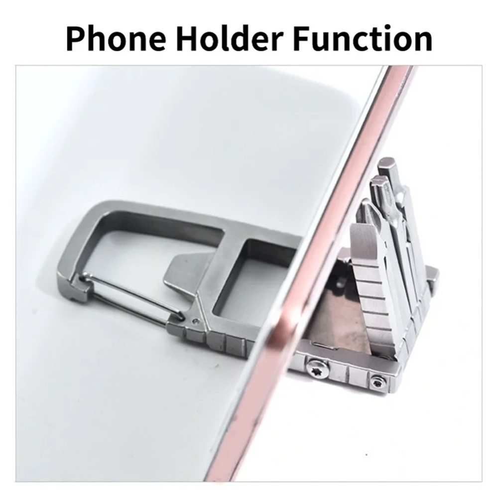 2.Included Functions: Contain large cross screwdriver bit, large slot screwdriver bit, hex screwdriver bit, small cross screwdriver bit, box opener, bottle opener, small slot screwdriver bit, card remove pin, carabiner, star screwdriver bit, mobile phone holder, ruler.