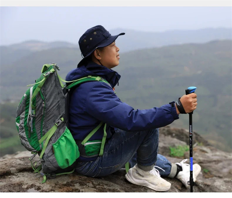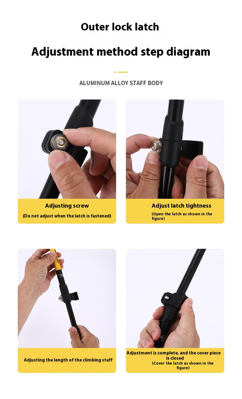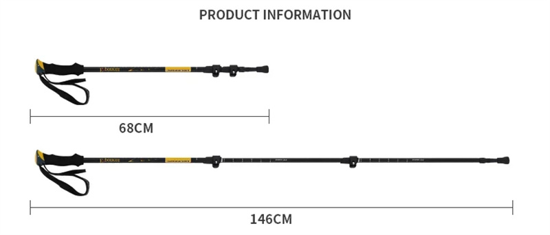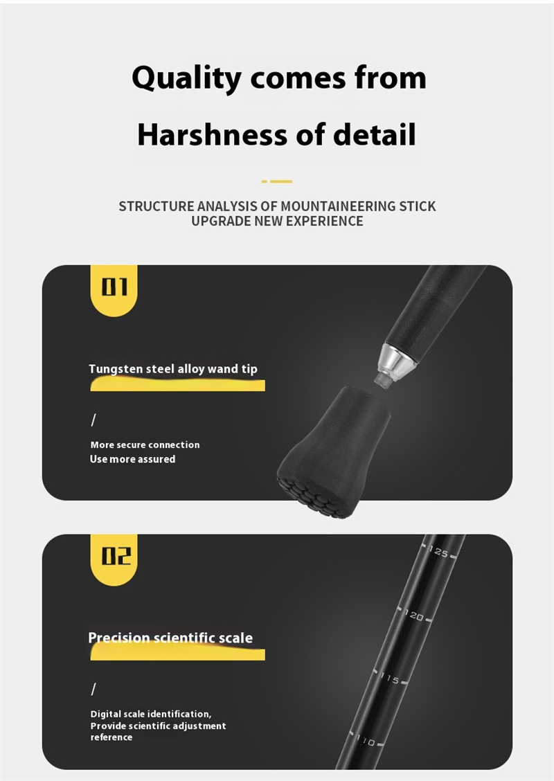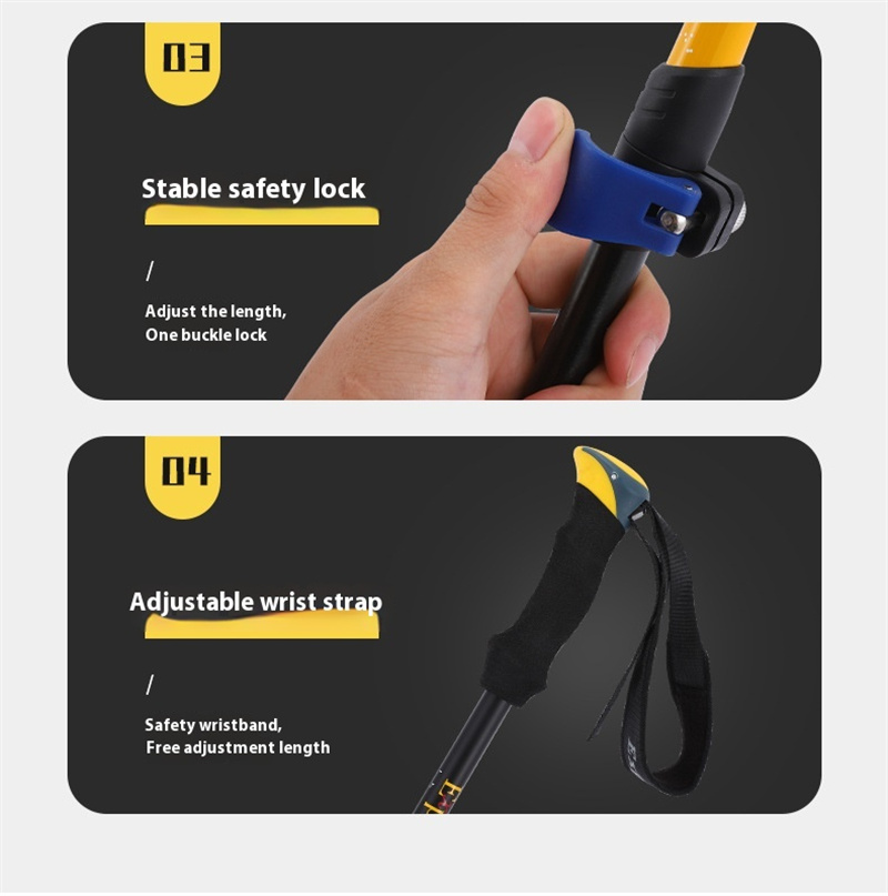 1.Made from strong and long-lasting aluminum alloy.2.An external lock mechanism for quick and easy height adjustment.3.An ergonomic handle for a comfortable grip.4.The lightweight design reduces fatigue during extended hikes.5.This product is ideal for outdoor activities such as trekking and walking.
