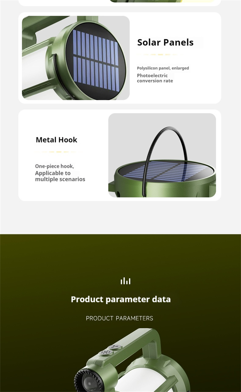 2.Solar and Type-C Charging: Equipped with a polycrystalline silicon solar panel, it efficiently converts sunlight into energy while also supporting fast Type-C charging for flexibility.