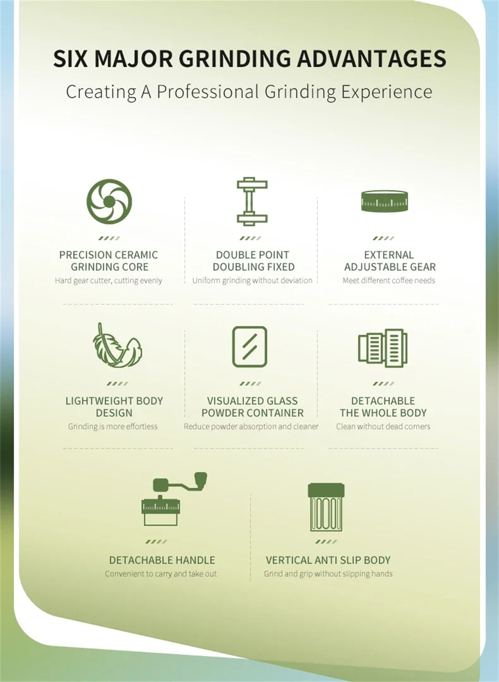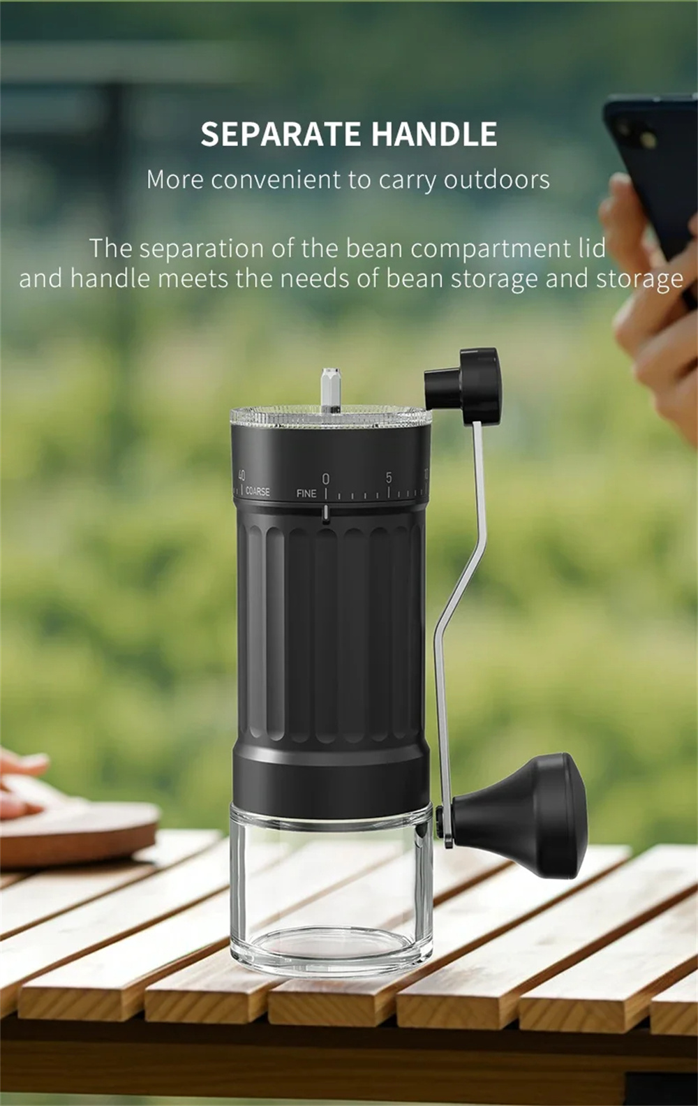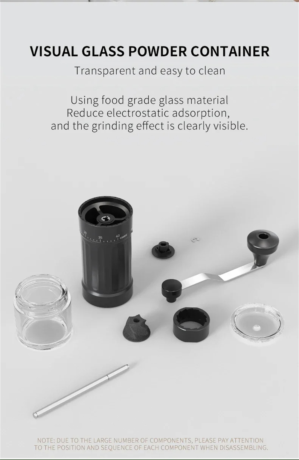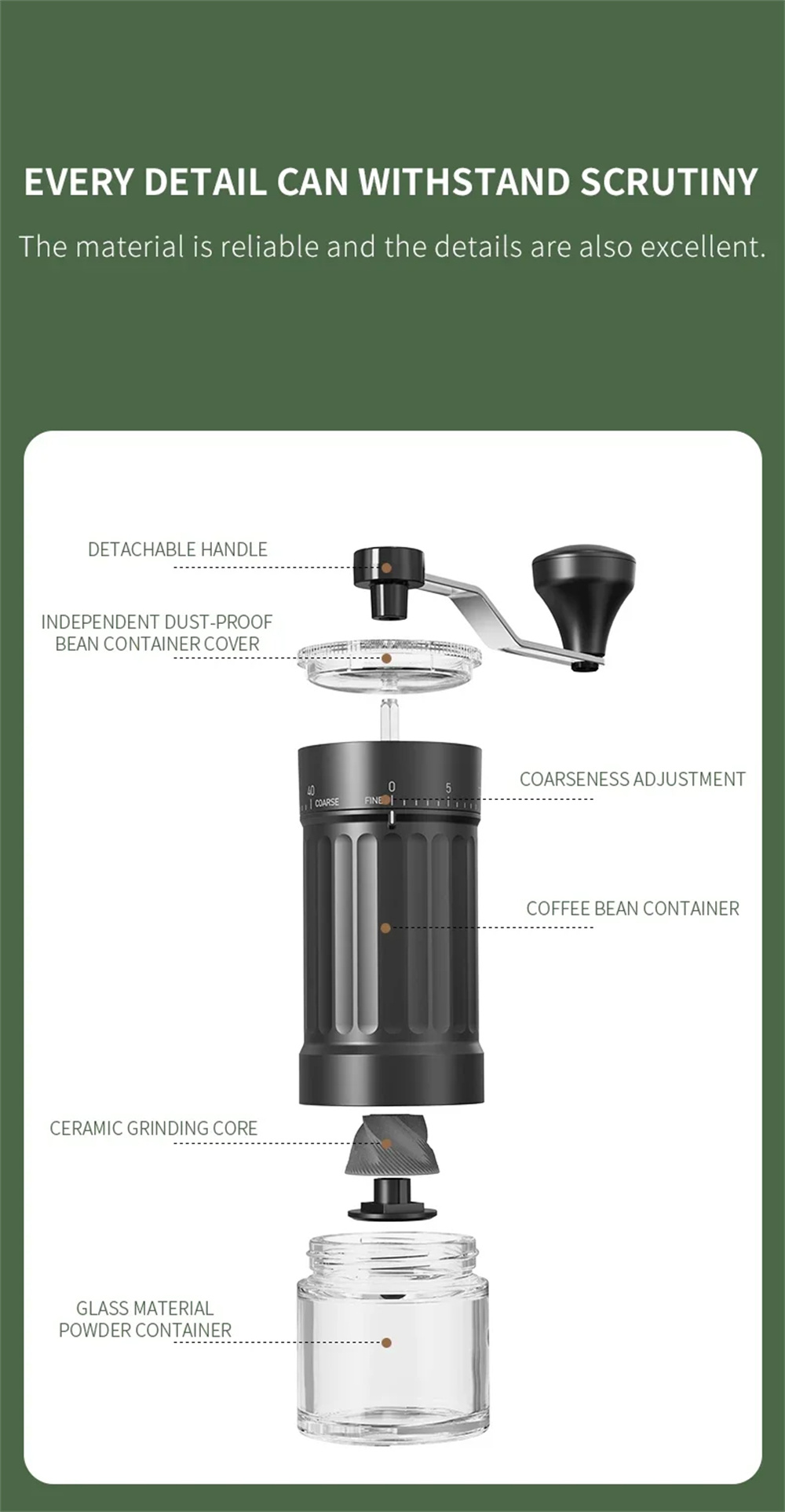 5.Easy to clean and maintain, the grinder's three main components are removable for hassle-free cleaning. Avoid washing with water to preserve coffee flavor; use the included brush or dry cloth instead. Elevate your coffee ritual with our versatile manual grinder.