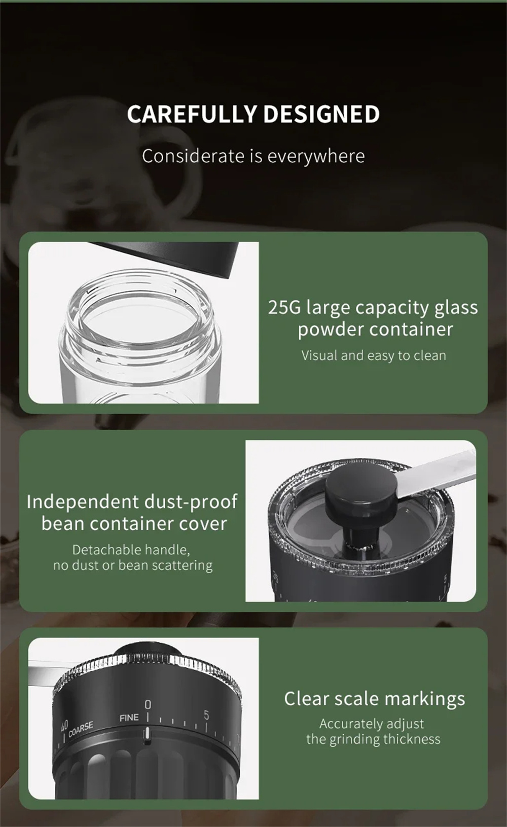 4.With a bean capacity of 25 grams and powder bin of 30 grams, grind enough beans at once for efficient brewing. For larger quantities, consider an electric grinder at home.