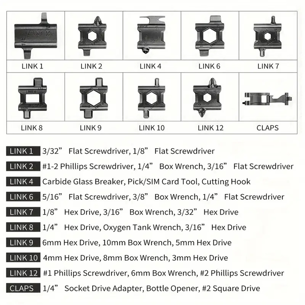 4.29 different tools in 10 links can be assembled multiple ways to customize this multi-tool to meet your needs.