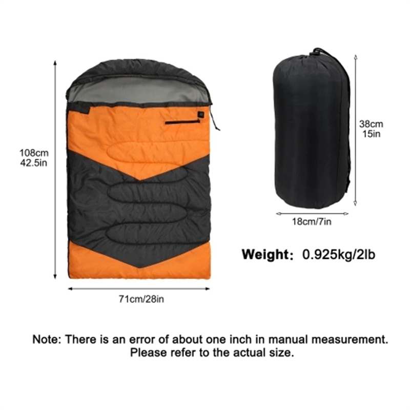 2.The heated sleeping bag can be powered by power bank (not included). With 3 heat temperature levels adjustable: Low (45℃) Medium (55℃)/ High (65℃) .