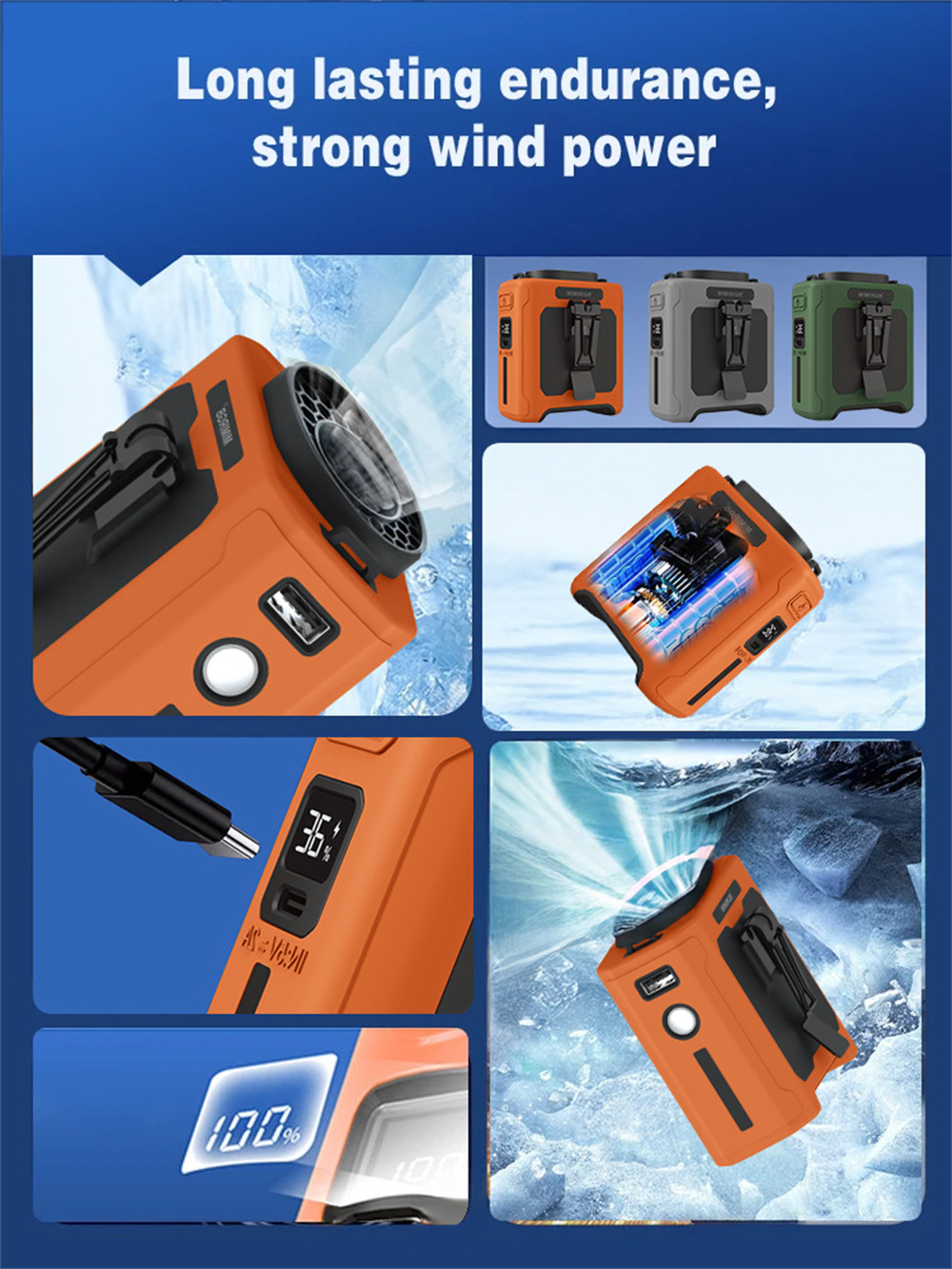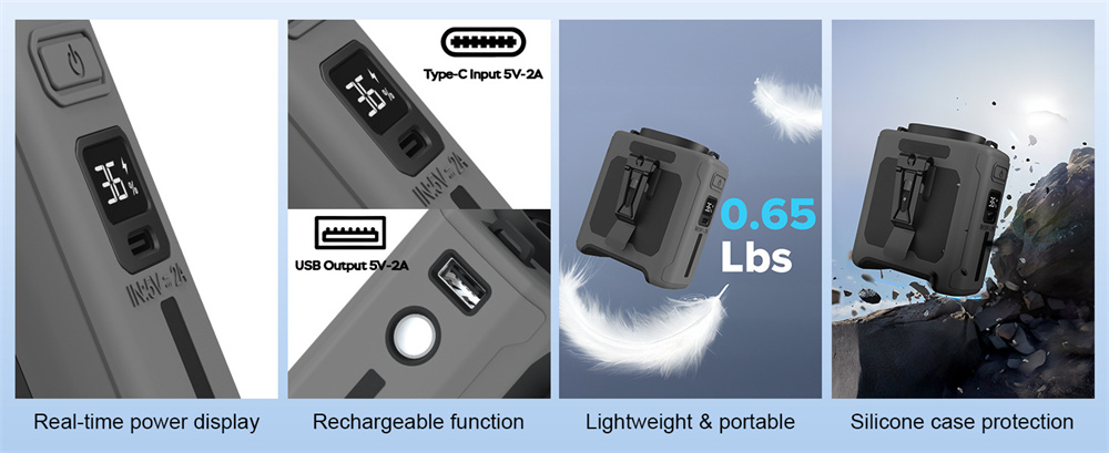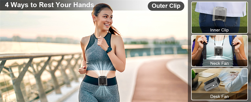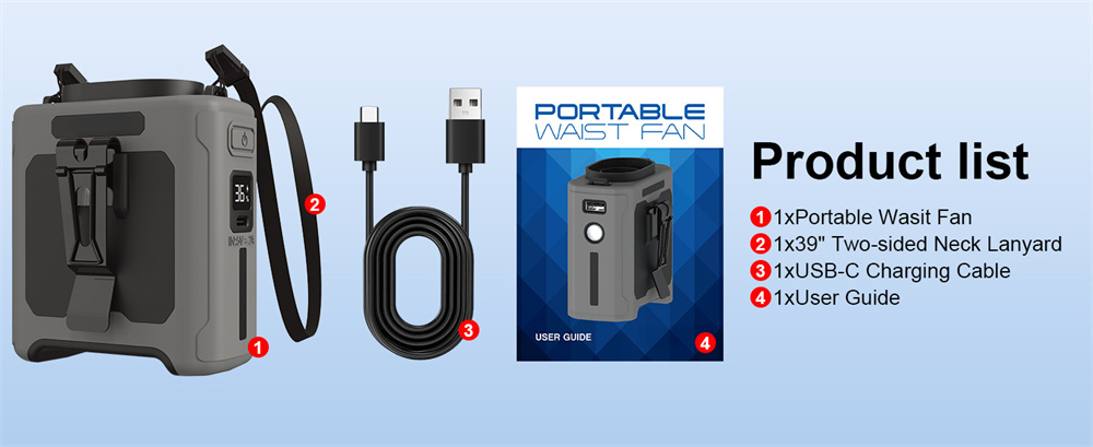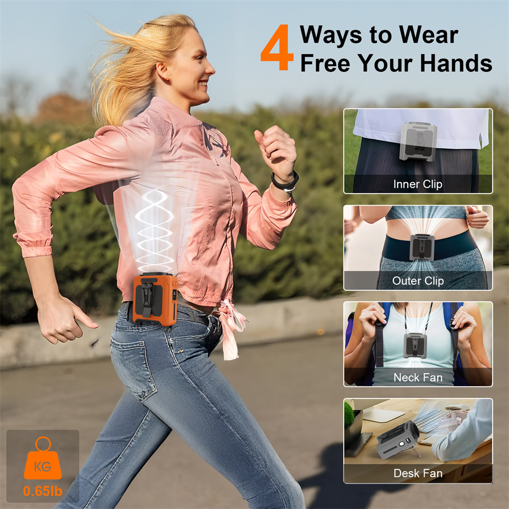1.[Waist Fan/Neck Fan/Desk Fan 3 in 1]: It's a portable USB fan with a multifunction - waist clip on fan, necklace fan, desk fan. When you work outside or for outdoor activities, take this portable fan and you'll get all the necessities.
