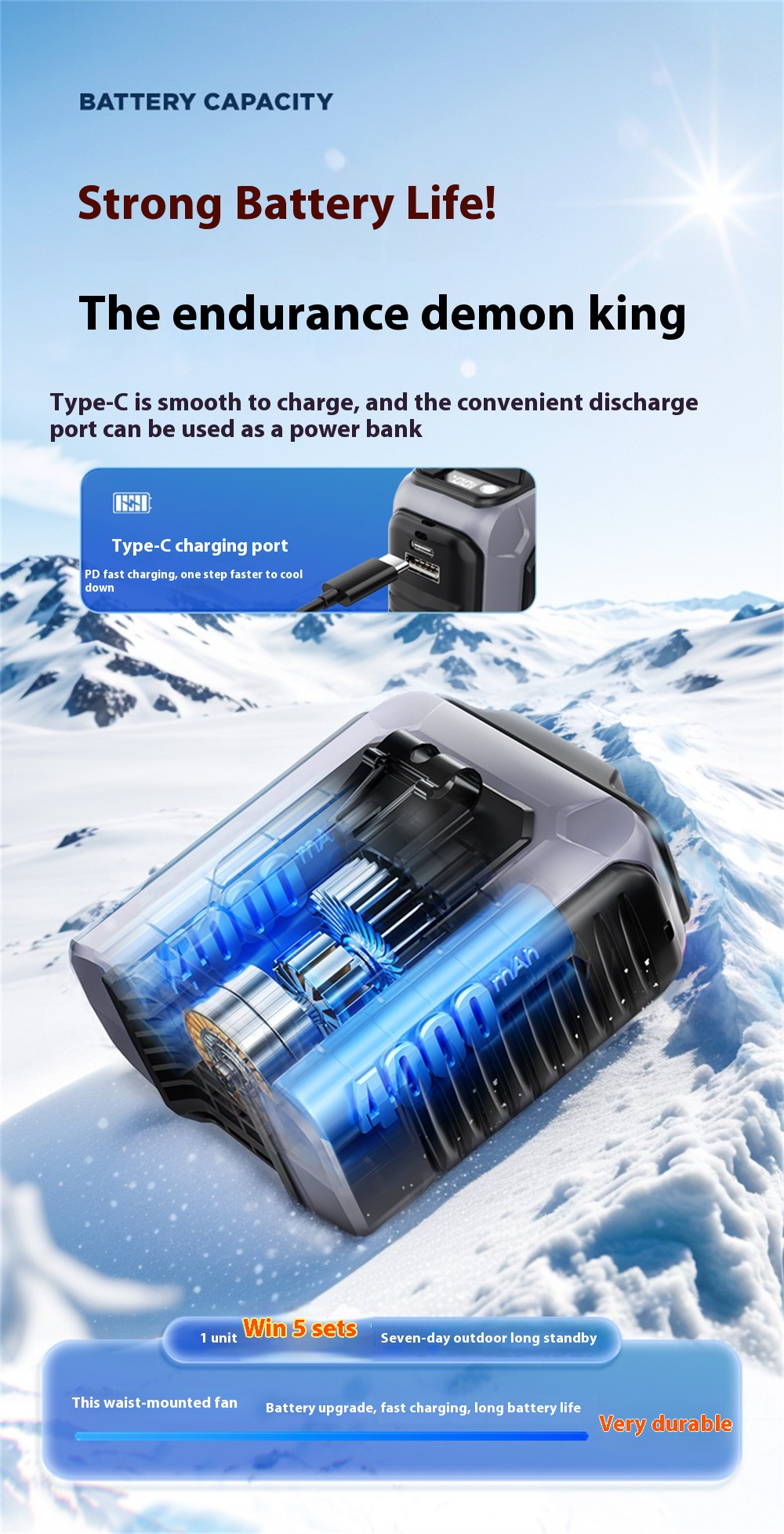 2.[10000mah Large Capacity Power Bank]: This Waist fan is built with a 1000mah large capacity rechargeable battery, the portable waist fan supports up to 30 hours long working time while blowing out gentle wind at a low speed. The fan also can be used as emergency power bank,free charge your phone, tablet, or other devices on the go.