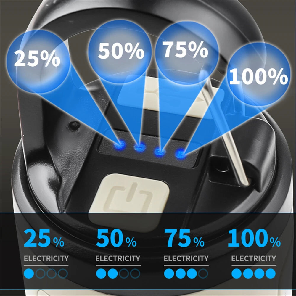 Sixth gear: strong light of main light-weak light of main light-flash of main light-33*LED white light -18*LED warm yellow light-12*LED warm orange light. Press and hold at any gear to turn it off |