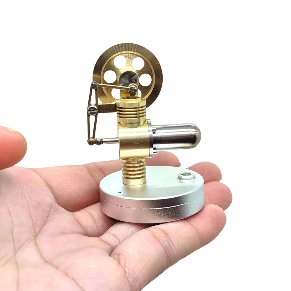 - This is a vertical Stirling engine model , a very small version model . crafted from brass and stainless steel , is designed with an upgraded base made of aluminum alloy .