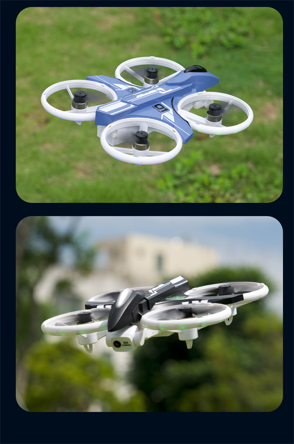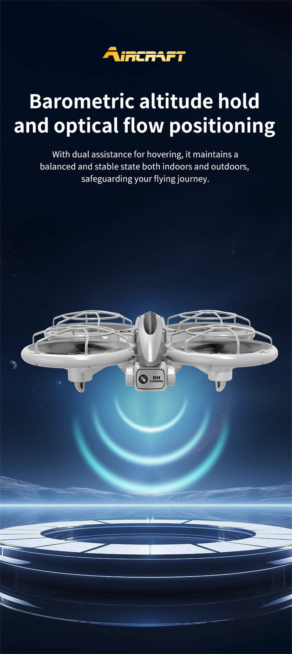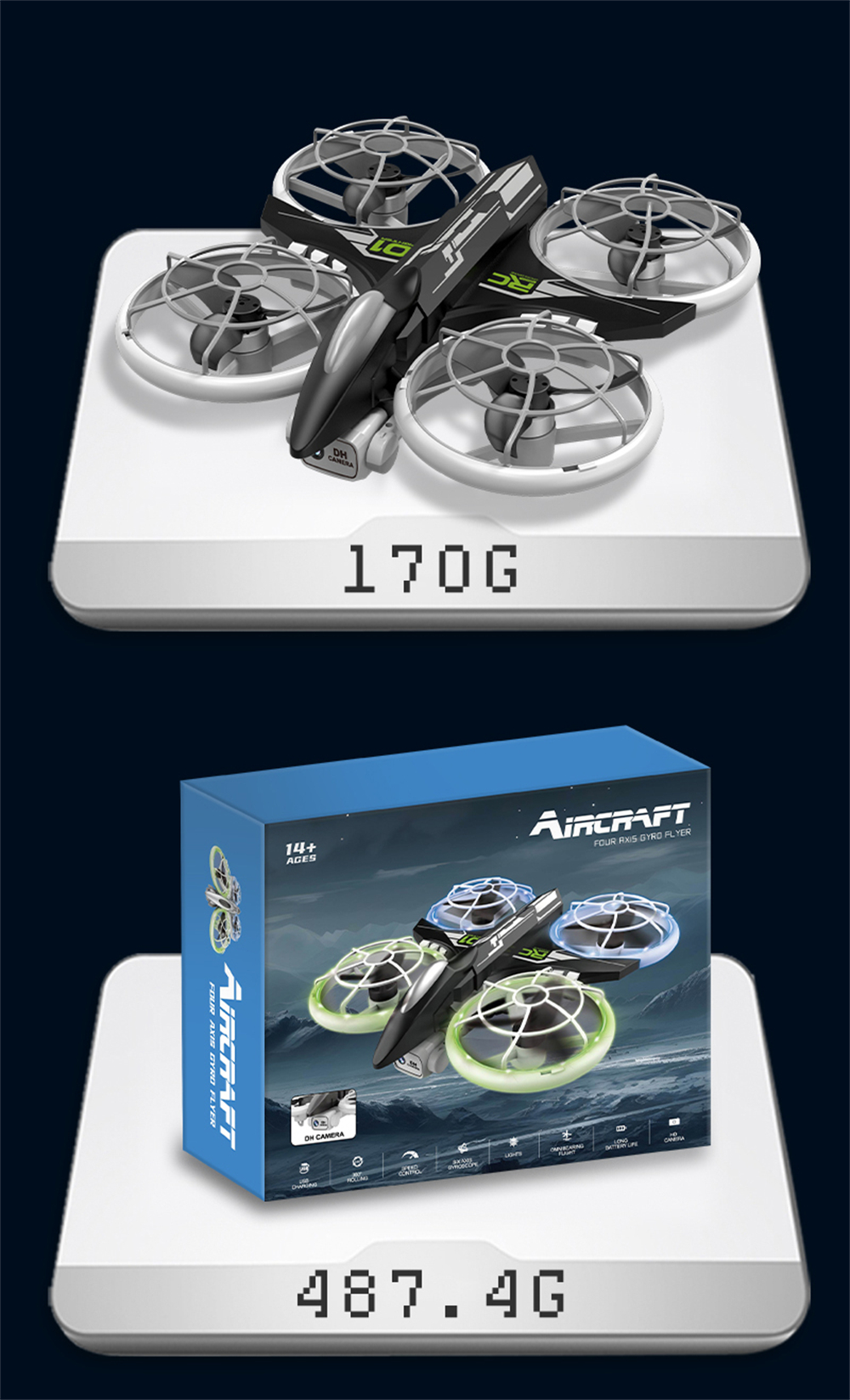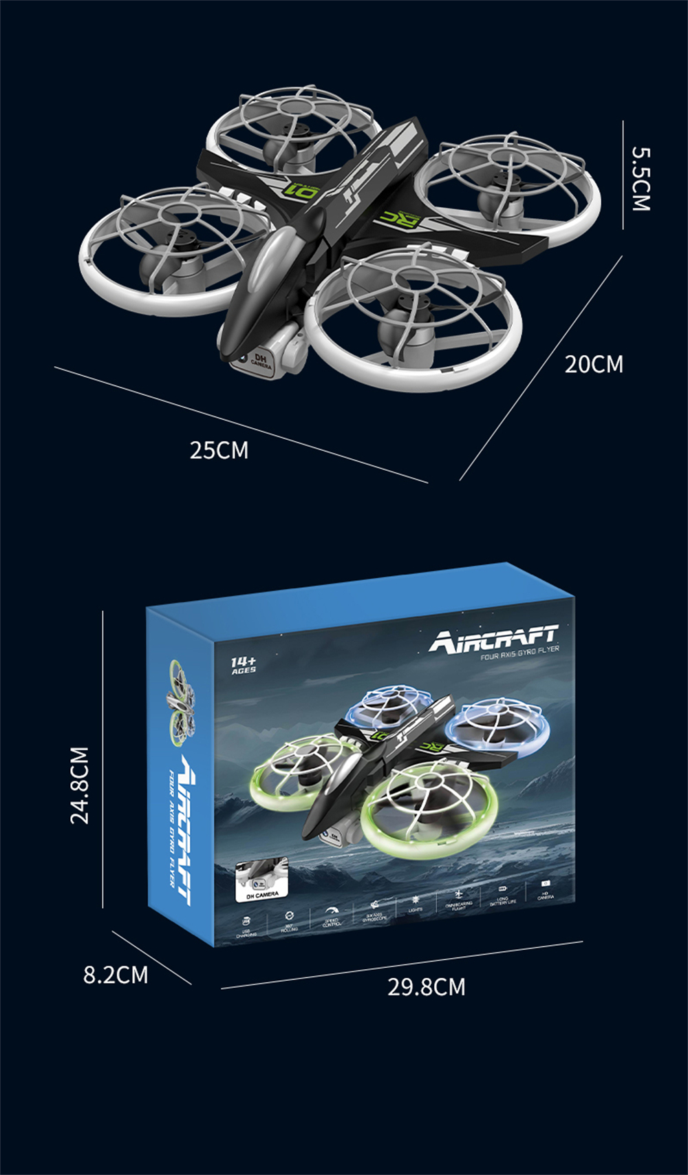 Propeller protection and protective net design, colorful lighting, HD electronically controlled camera, brushless motor, one-button takeoff and landing, headless mode, air pressure altitude control, optical flow positioning, three-speed adjustment, anti-collision and drop resistance, gyroscope calibration, 360° stunt rolls, modular battery, mobile phone app connection control, forward flight, backward flight, ascending flight, descending flight, left and right flight