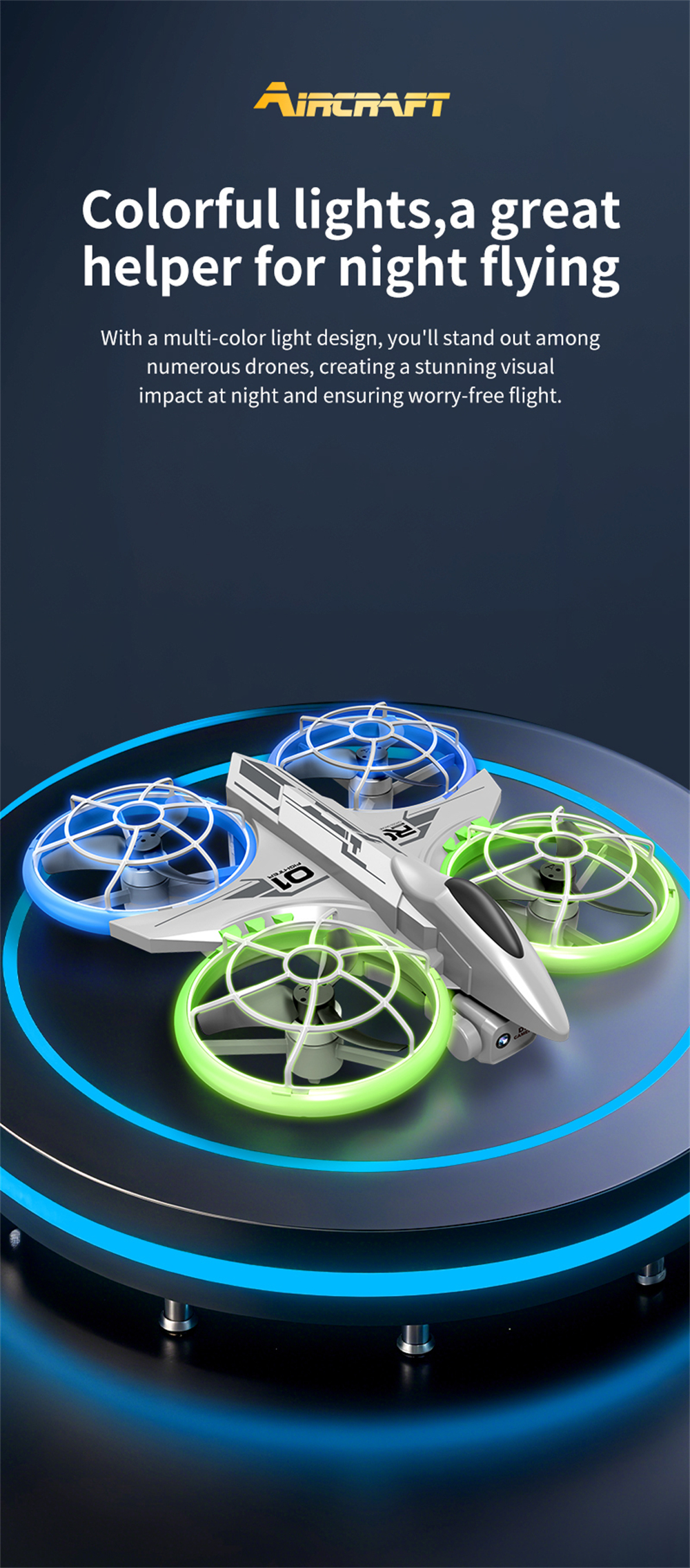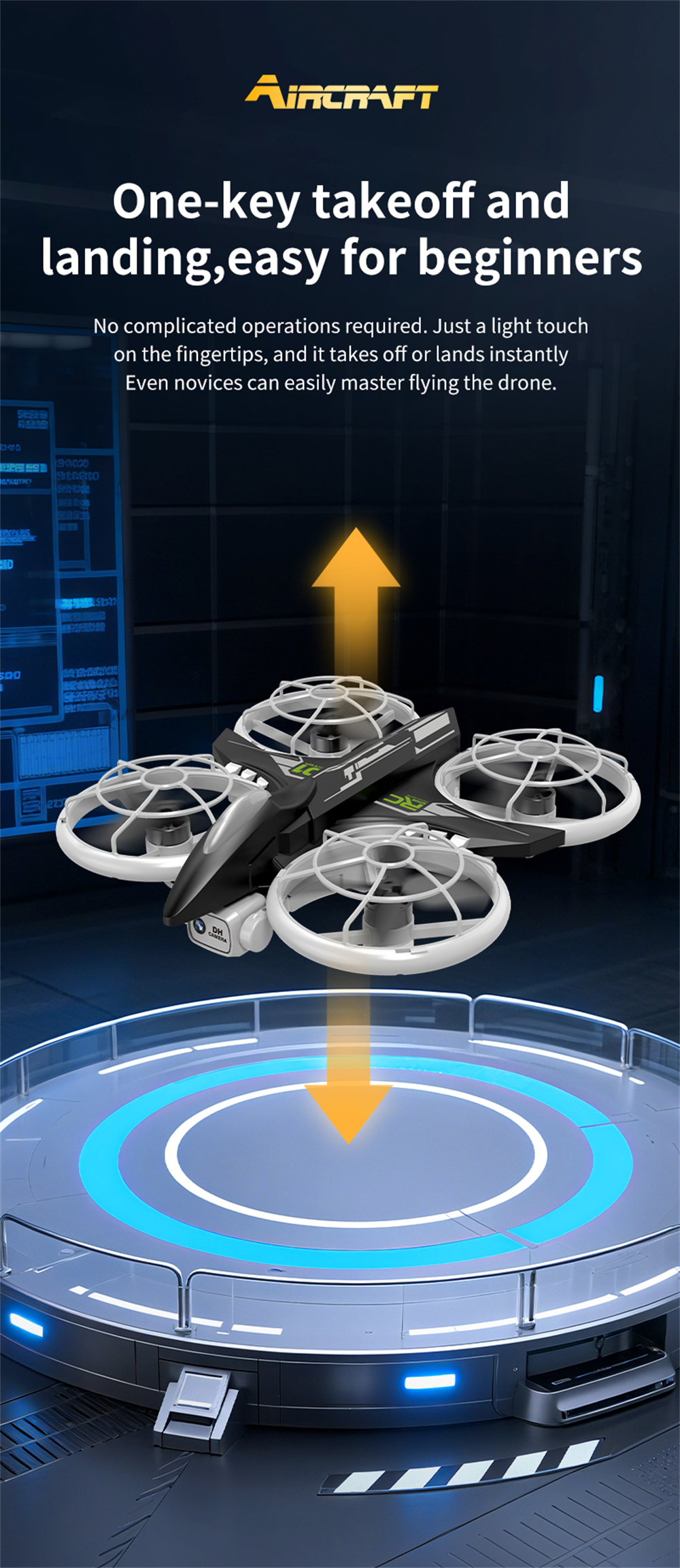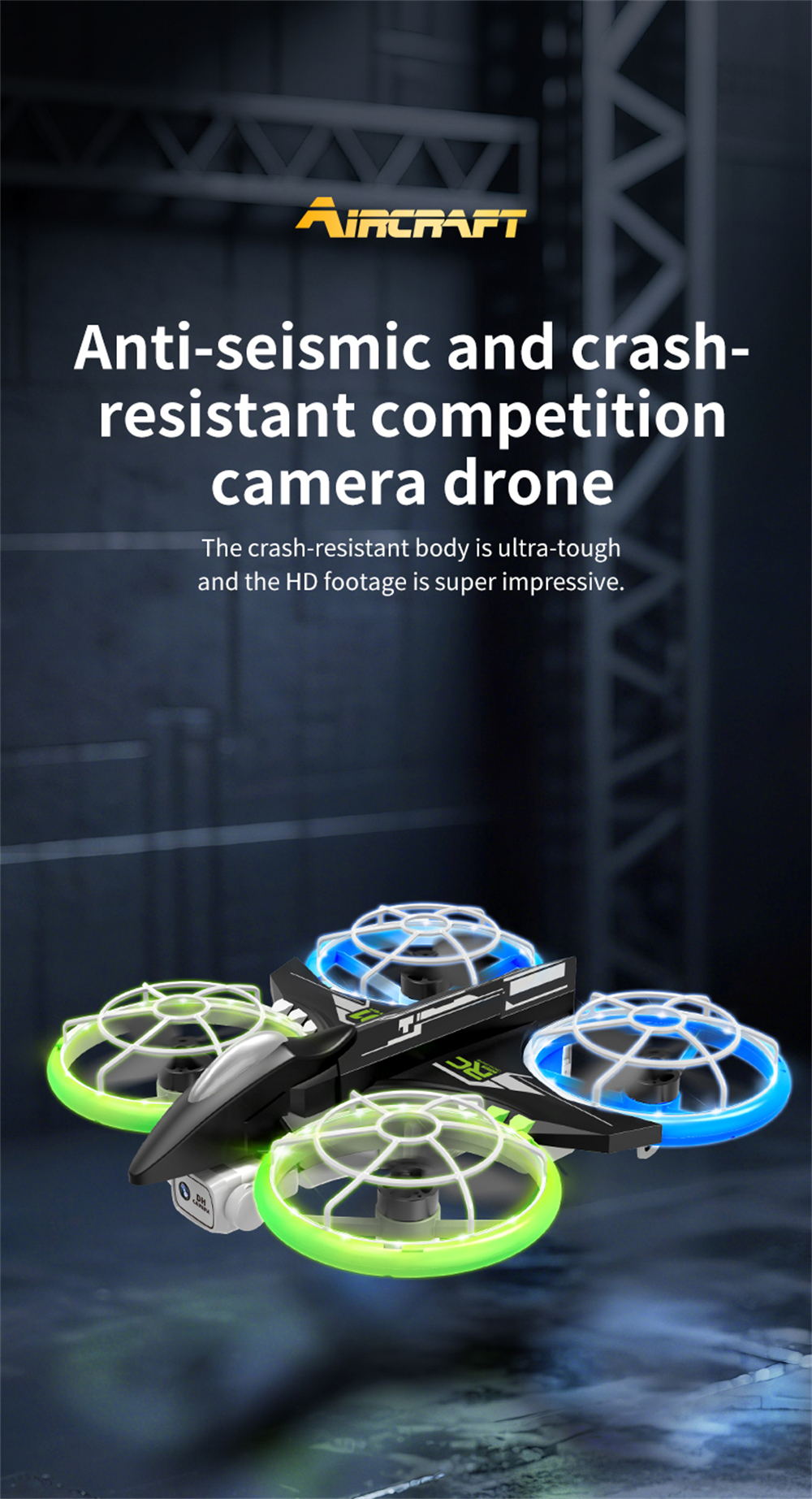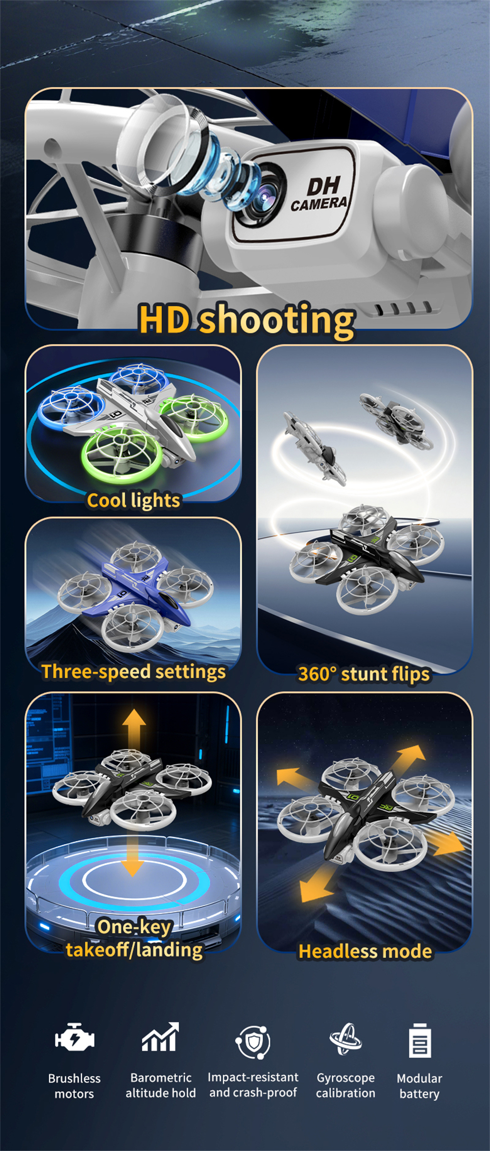 Propeller protection and protective net design, colorful lighting, HD electronically controlled camera, brushless motor, one-button takeoff and landing, headless mode, air pressure altitude control, optical flow positioning, three-speed adjustment, anti-collision and drop resistance, gyroscope calibration, 360° stunt rolls, modular battery, mobile phone app connection control, forward flight, backward flight, ascending flight, descending flight, left and right flight