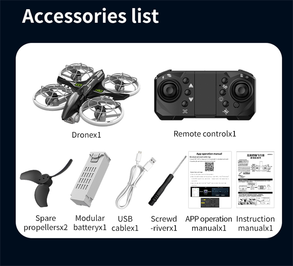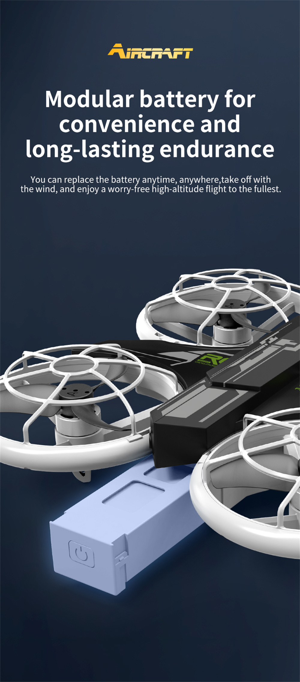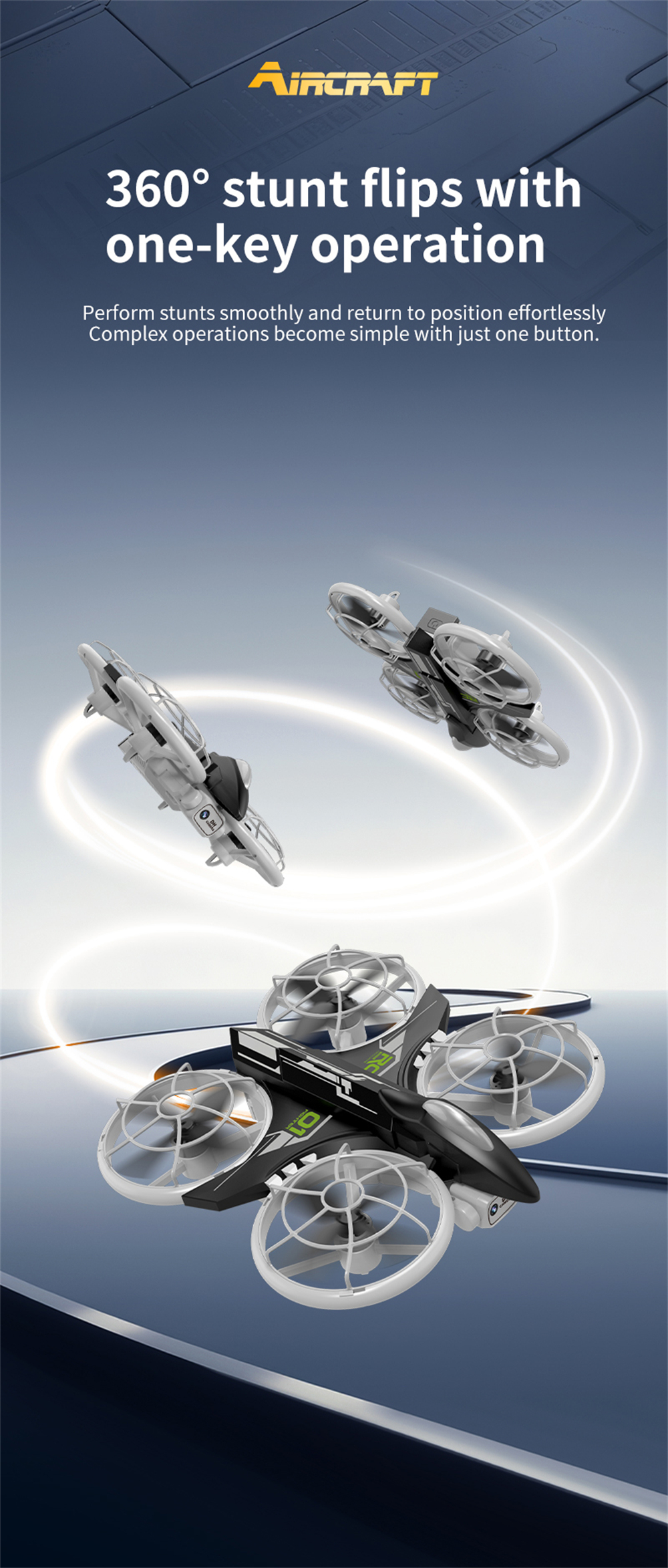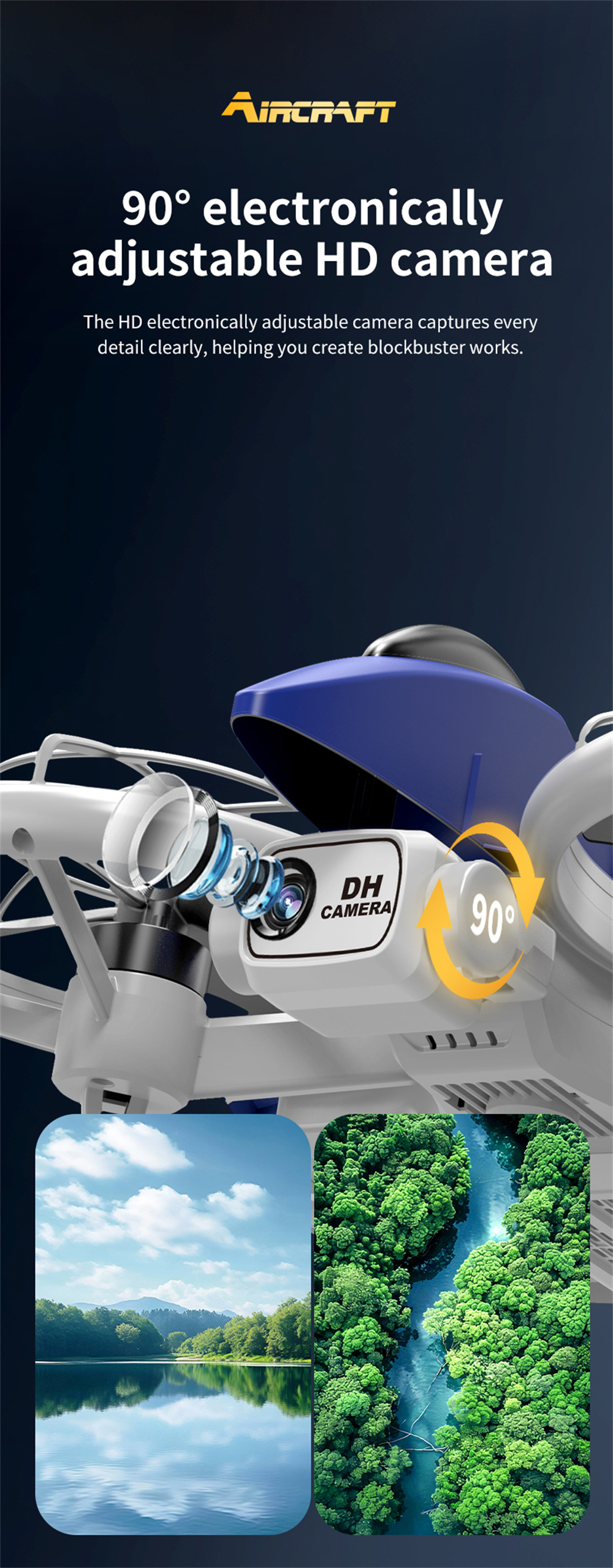 Propeller protection and protective net design, colorful lighting, HD electronically controlled camera, brushless motor, one-button takeoff and landing, headless mode, air pressure altitude control, optical flow positioning, three-speed adjustment, anti-collision and drop resistance, gyroscope calibration, 360° stunt rolls, modular battery, mobile phone app connection control, forward flight, backward flight, ascending flight, descending flight, left and right flight