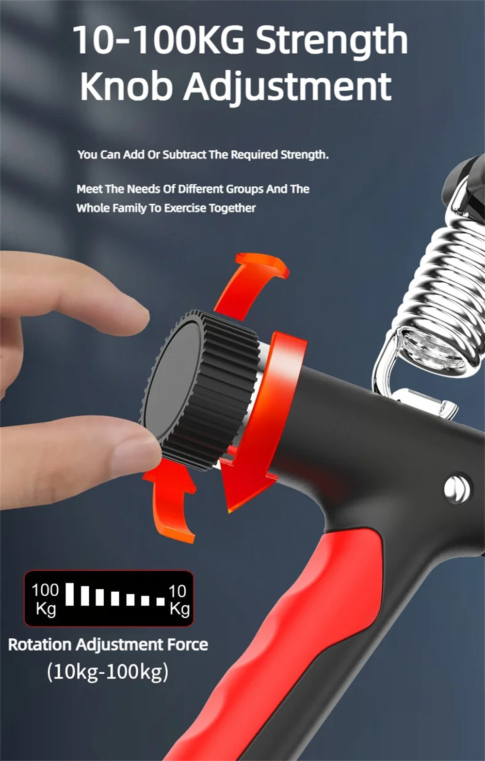 1. Knob Adjustable Resistance: 10-100kg: Our hand grip strengthener features a knob-adjustable resistance mechanism, allowing users to customize the strength from 10kg to 100kg. This flexibility makes it suitable for individuals of different fitness levels and enables the whole family to exercise together.