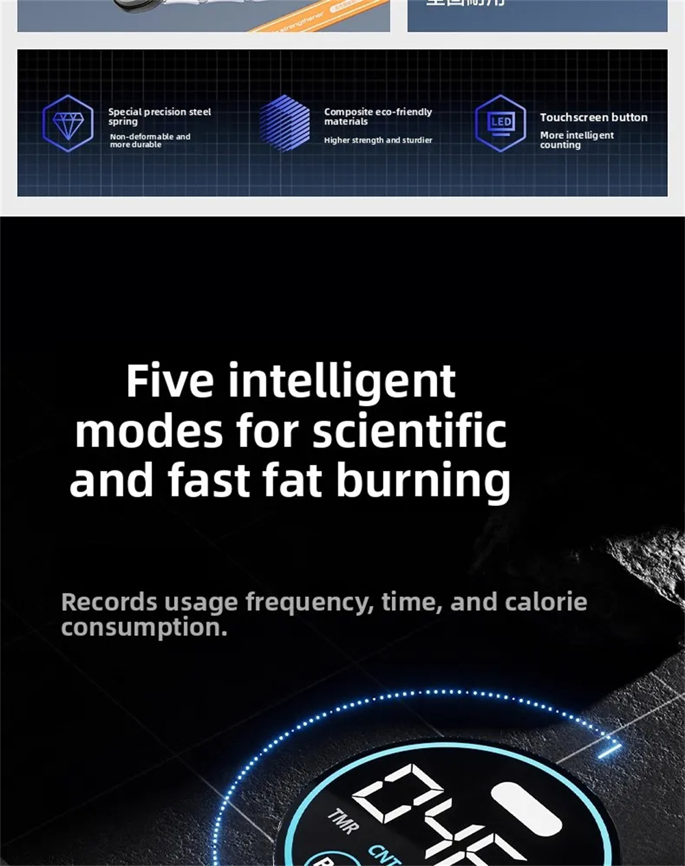 5. It offers multiple smart modes including timer, counter, and calorie tracker, along with a rechargeable battery and night-friendly screen for convenient workouts anytime.