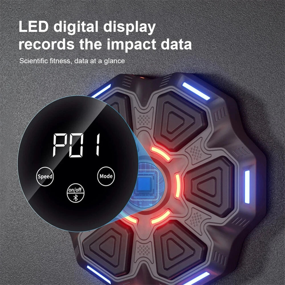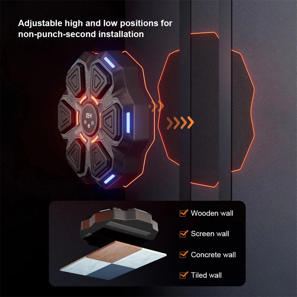 1. Adjustable Speed: Customize your workout intensity with adjustable striking speed, built to handle powerful hits.2. bluetooth Music: Seamlessly connect to your smartphone and play your favorite music while you punch along with the rhythm and lights.3. Interactive Modes: Enhance your reflexes and coordination with smart sensors that adjust speed and light rhythm.4. Family Fitness: Boost reaction skills and enjoy quality family time with this wall-mounted equipment that combines music and exercise.5. Easy Installation: Install easily indoors or outdoors with a strong adhesive strip, maximizing floor space and secure attachment.