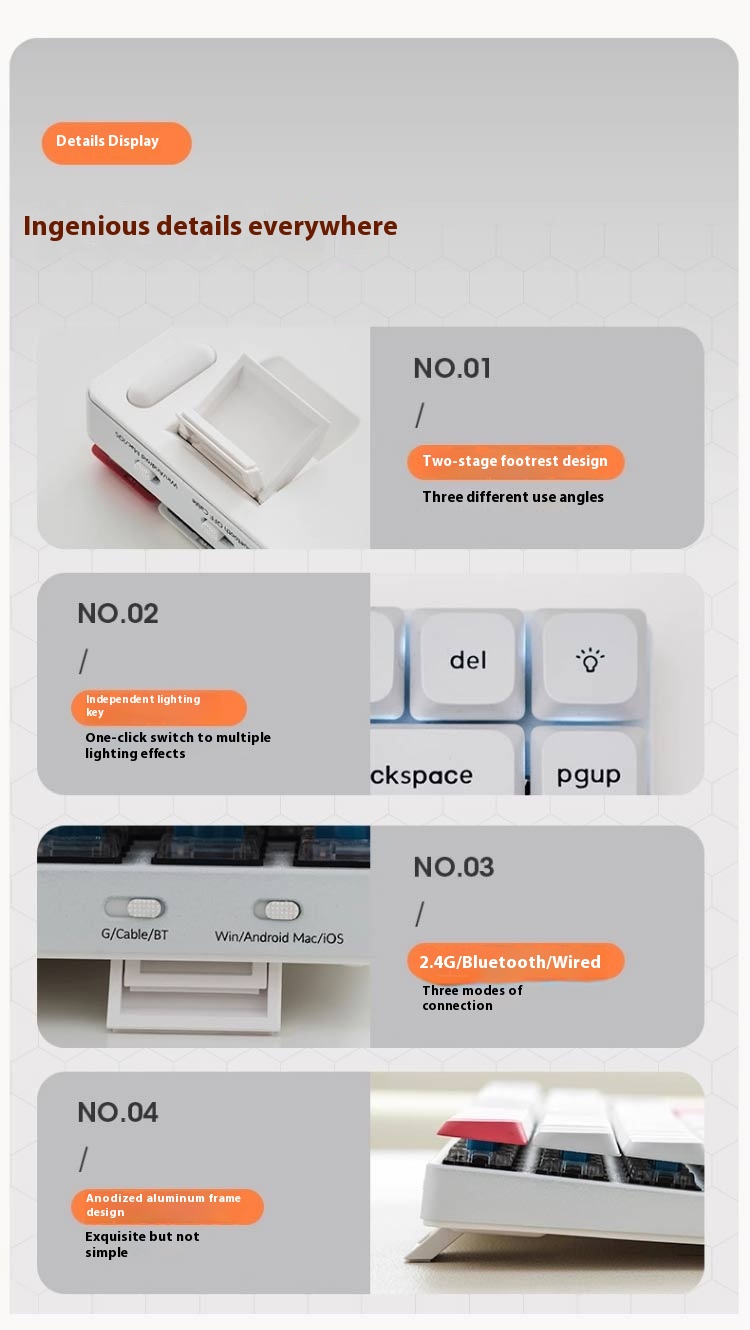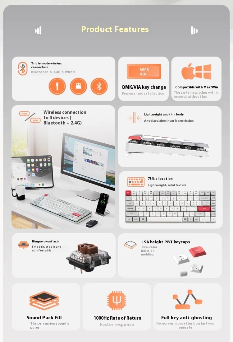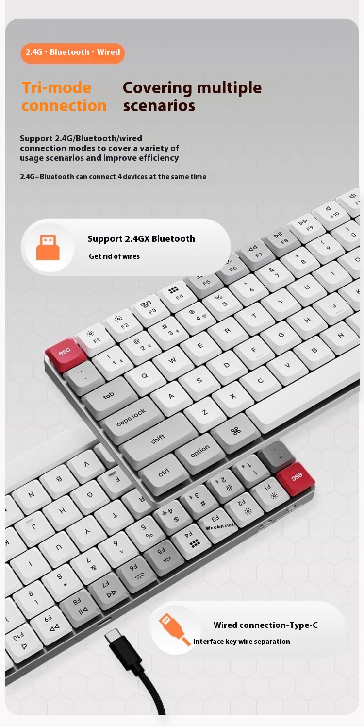 1. Tri-mode Connectivity: Offers versatility with 2.4G wireless, bluetooth 5.1 (connects up to 4 devices), and wired connection via Type-C.
