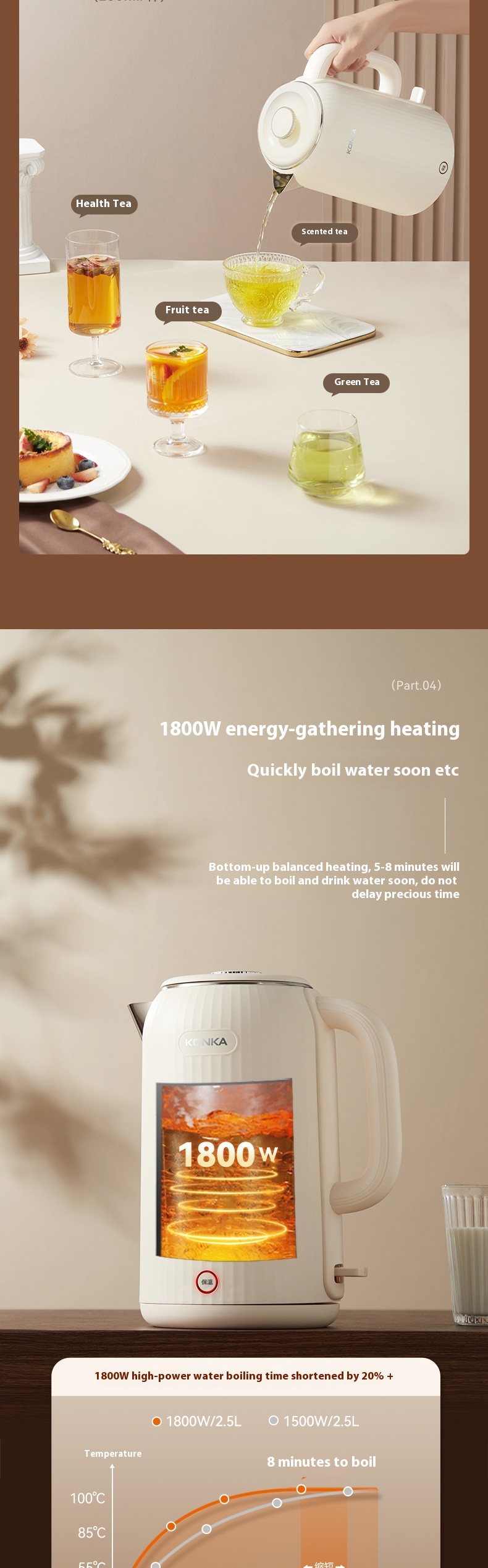 - Comprehensive Safety Features: Equipped with a double-layer anti-scalding body, this kettle ensures safe handling. Additional safety measures include boil power cut-off and anti-dry burn protection, providing multiple layers of security during use.