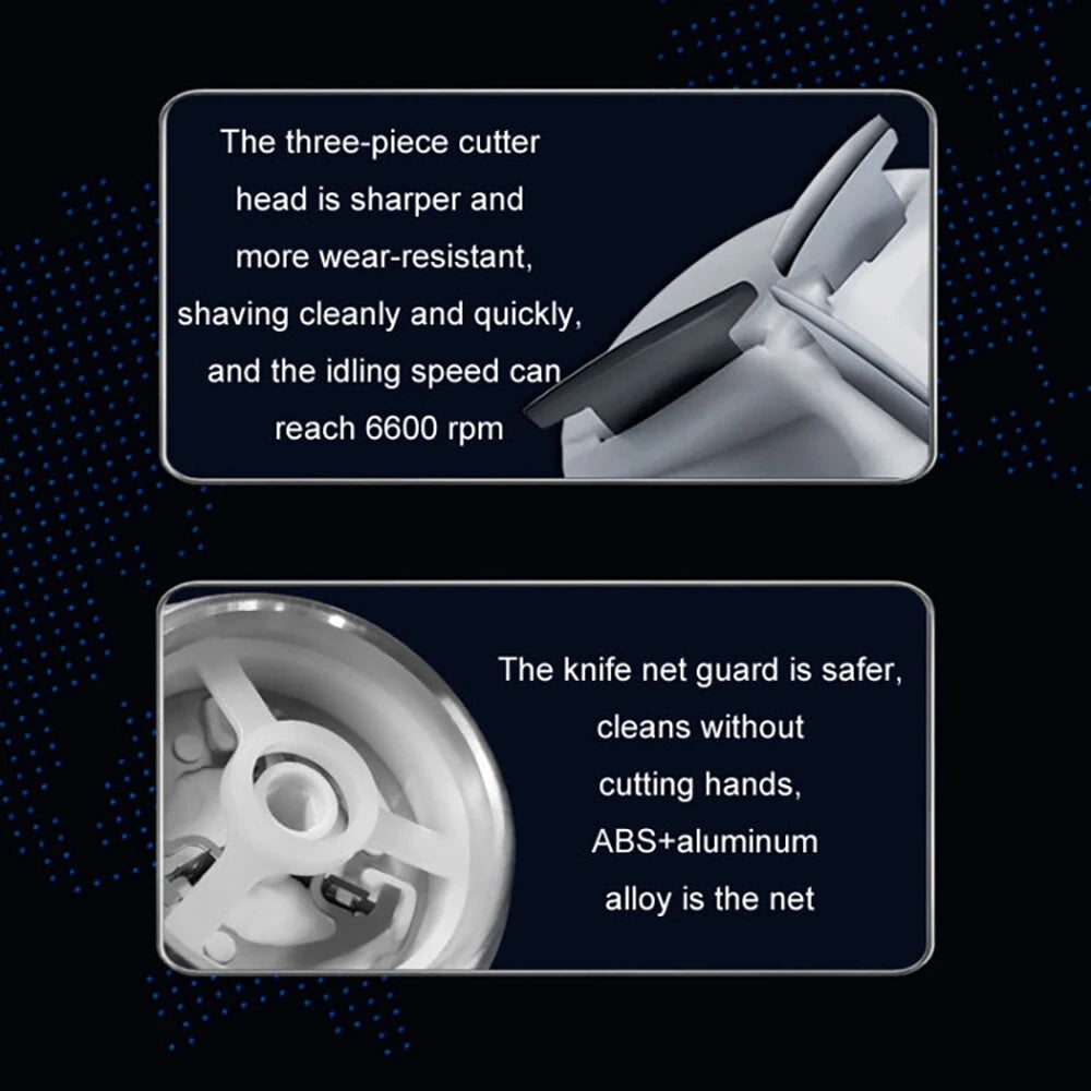 - High-Performance Blades: The three-piece cutter head, crafted from high-quality materials, is both sharper and more resilient. It delivers a clean shave quickly, with an idling speed of up to 6600 rpm, ensuring efficiency and precision.