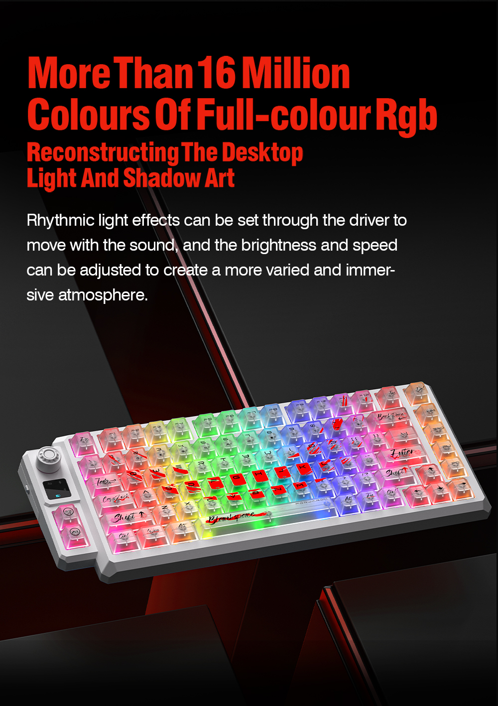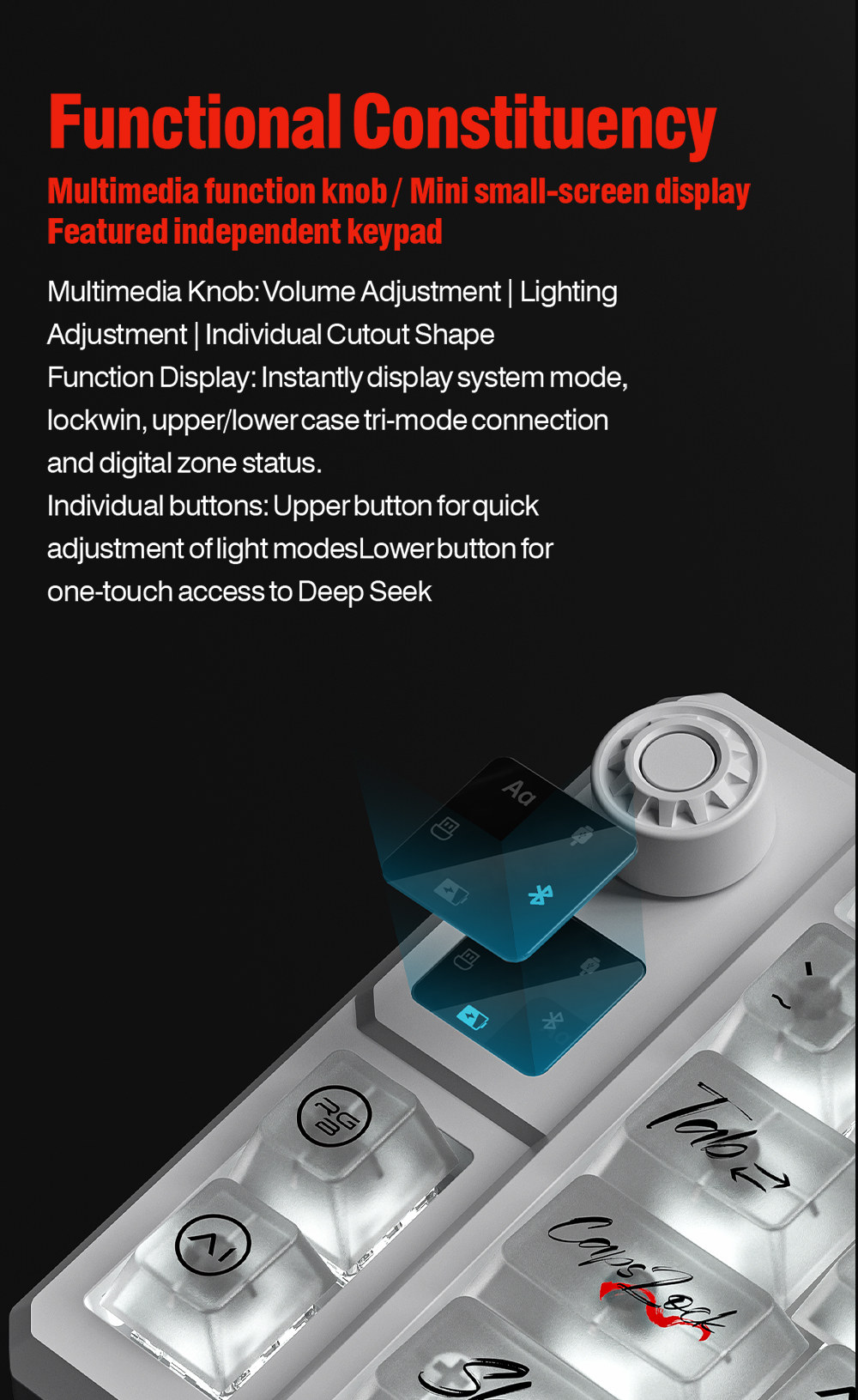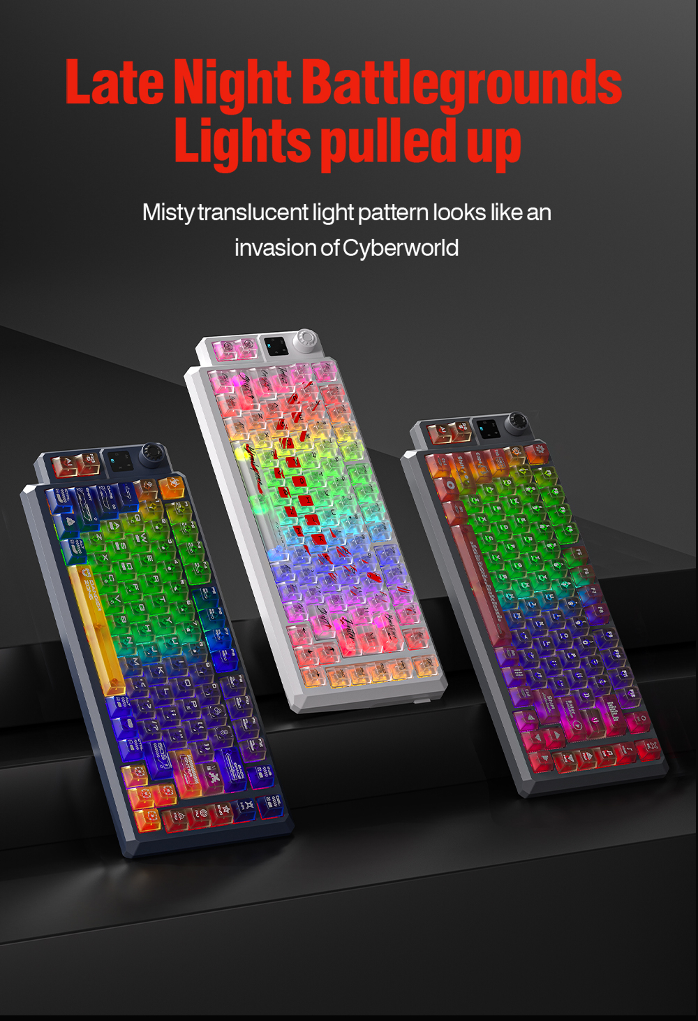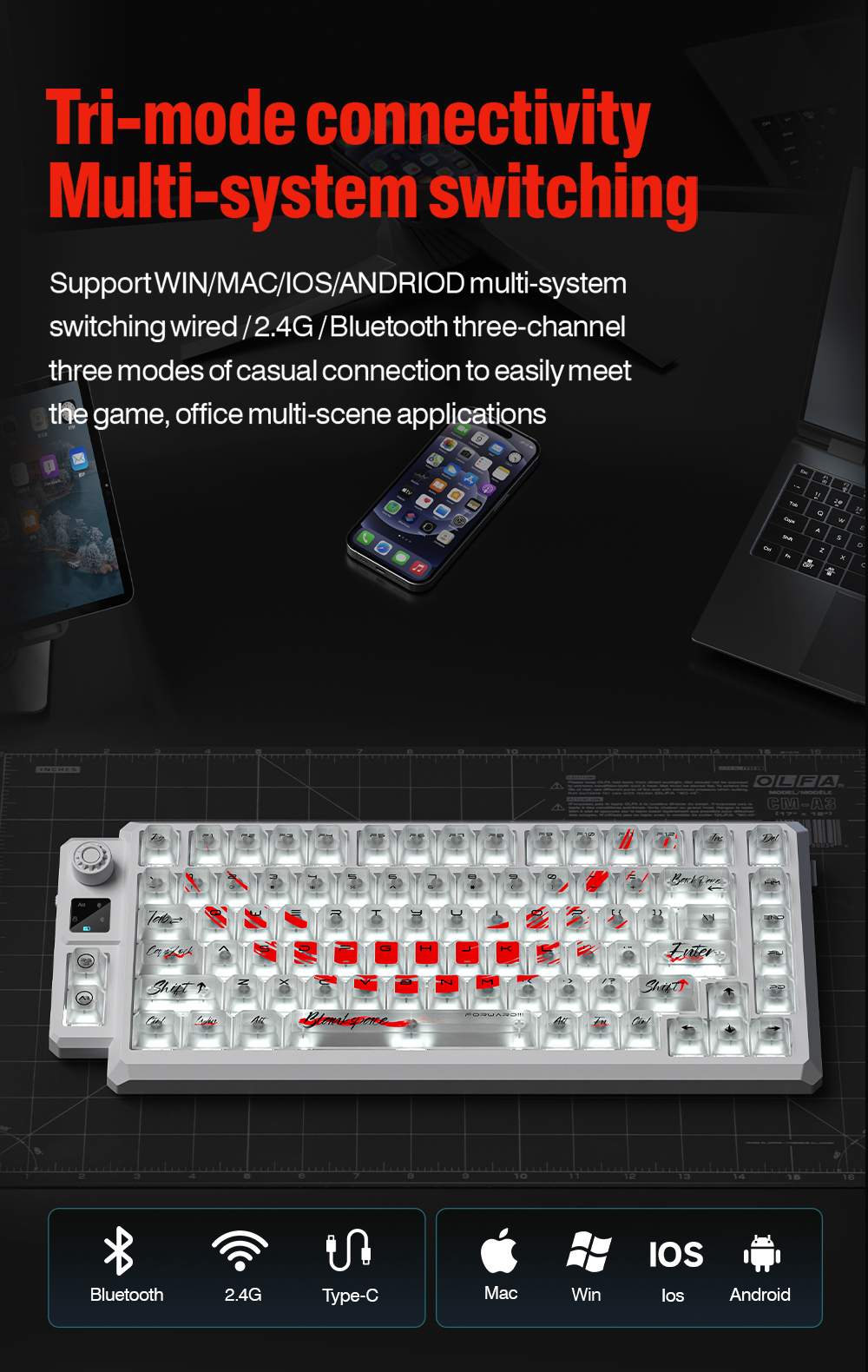 1. Tri-mode Connectivity: Wired Type-C, 2.4G wireless, and bluetooth compatibility for effortless device switching across Windows, for macOS, iOS, and Android.2. Multimedia Knob: Integrated knob for seamless volume adjustment and lighting control.