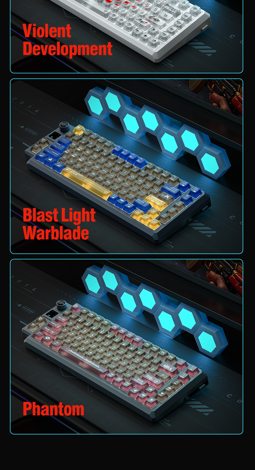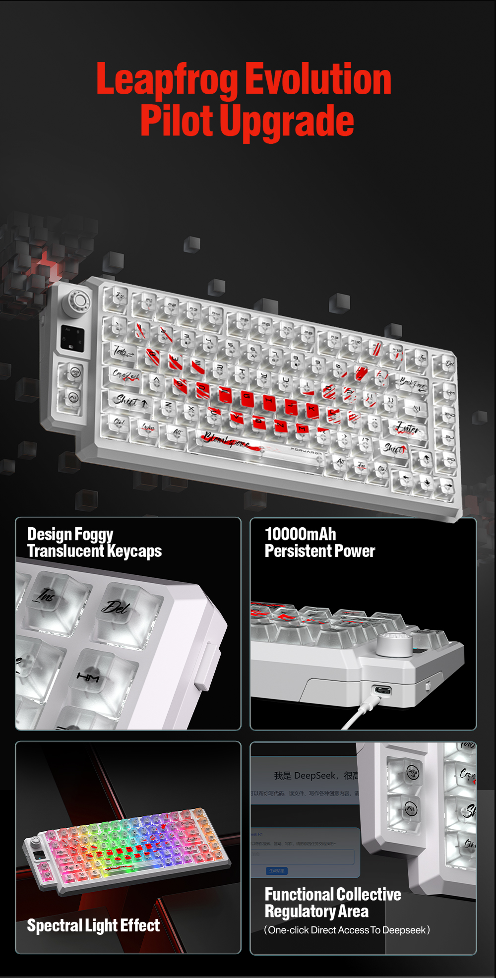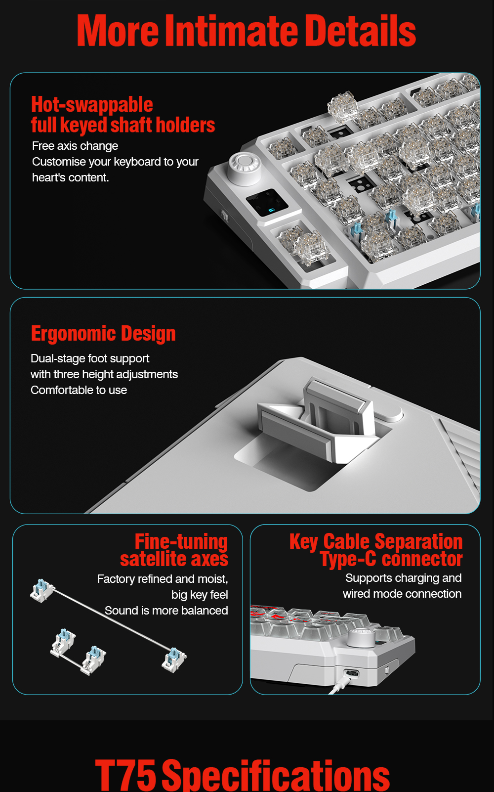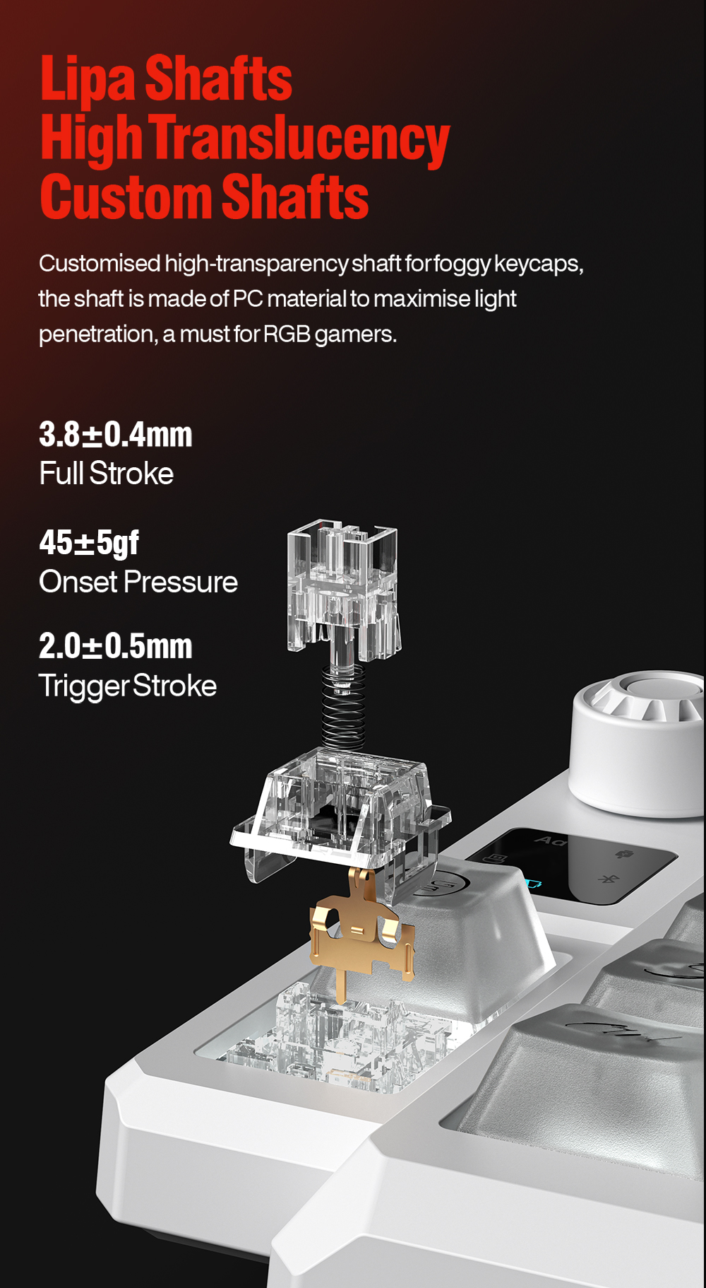1. Tri-mode Connectivity: Wired Type-C, 2.4G wireless, and bluetooth compatibility for effortless device switching across Windows, for macOS, iOS, and Android.2. Multimedia Knob: Integrated knob for seamless volume adjustment and lighting control.