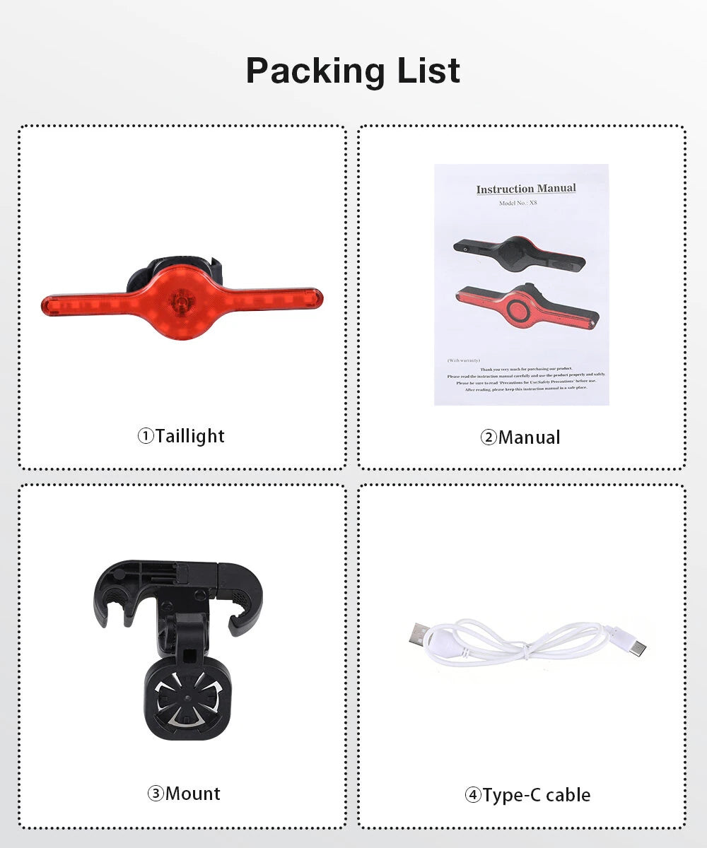 ● Support Wireless Remote Control, which is more convenient for riding safely. ● Up to 120dB loud turning sound allows more attention for oncoming pedestrians. ● Brake sensing technology automatically turns on/off the light when you brake. ● 20 High-quality LED beads provide bright and efficient lighting effects. ● 7 different lighting modes and 180° light range, meeting various cycling needs. ● High-capacity 400mAh battery supports up to 22 hours of working time. ● IPX5 Waterproof ensures not be damaged by rain or water splashes for cyclists. ● USB-C universal design, fast charging in just 2 hours. Specification: