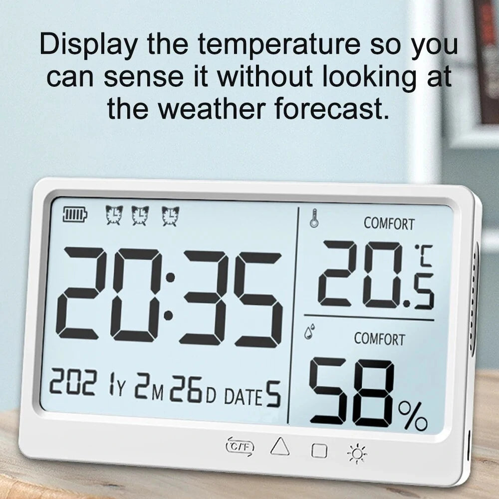 This is a kind of quality clock, LCD display, clearly display the time, calendar, week, temperature, humidity, and etc.. Selected high accuracy temperature and humidity sensors, let you knew the weather situation clearly. You can have a try.Features:1. Measuring indoor and outdoor temperature and humidity, Celsius and Fahrenheit conversion.2. The screen size is so large that even the elderly can see the times.3. Display the temperature so you can sense it without looking at the weather forecast.4. When the battery is low, there is an icon to show, so that you can charges it in times.5. With alarm function, you don't have to worry about oversleeping.Specifications:Product model: MY-13Indoor and outdoor stability measurement range: -10~50℃Temperature measurement accuracy: ±1℃Temperature resolution: 0.1℃Humidity measurement range: 10%RH~95%RHHumidity measurement accuracy: ±5%RHHumidity Resolution :1% Resolution :1%Temperature/humidity measurement period: 2 secondsDisplay mode: LCD displayOperating voltage: 3.7VPower supplys battery: 300mAhItem size: 125 * 77 * 16mm / 4.9 * 3.0 * 0.6inItem weight: 78g / 3.1ouncePackage size: 160 * 90 * 20mm / 6.3 * 3.5 * 0.8inPackage weight: 110g / 4.3ouncePacking List:1 * Alarm Clock1 * USB Cable1 * English Manual